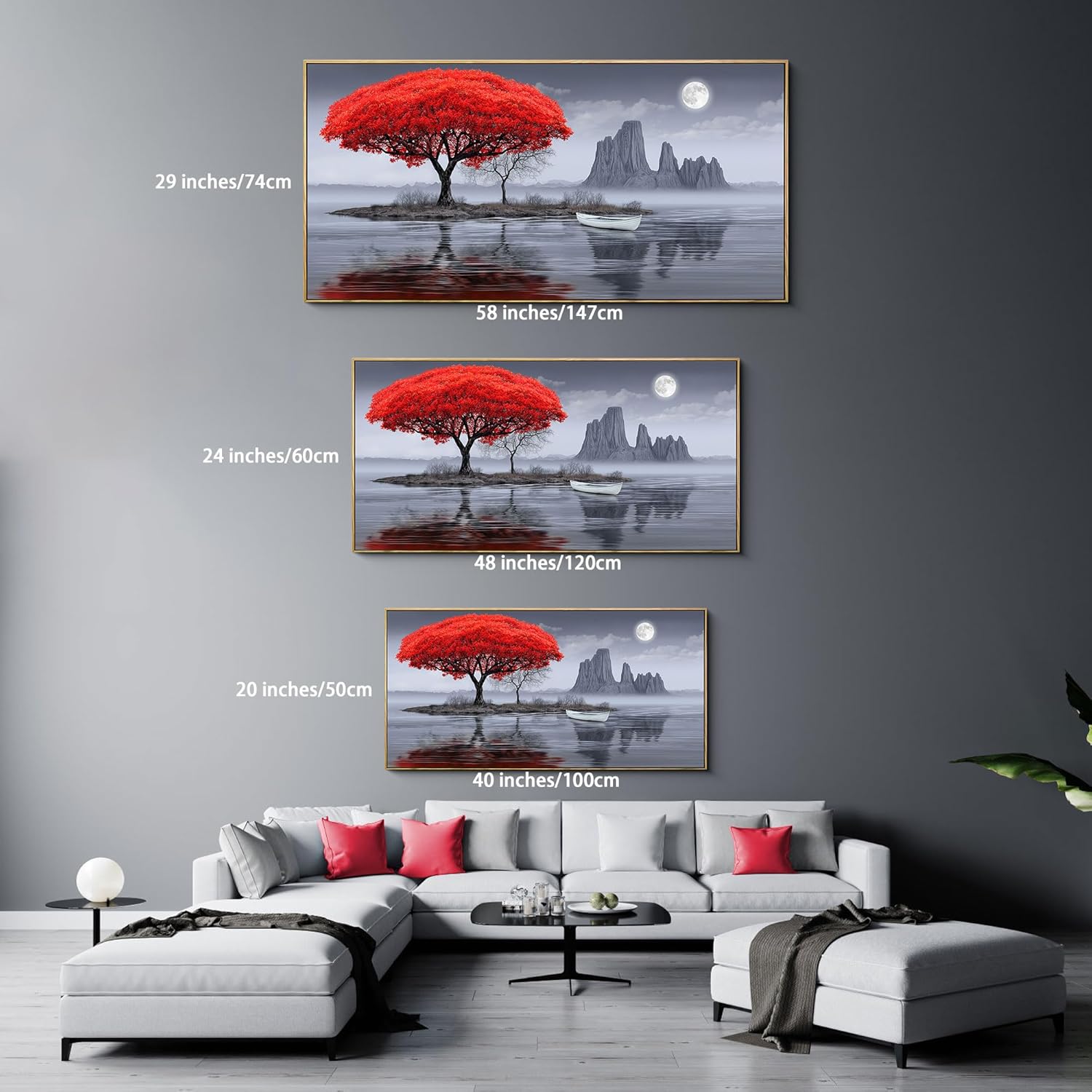XLSJERST Large Wall Art - Red Tree Living Room Wall Decor Frame Modern Canvas Artwork Moon Landscape Lake Picture for Bedroom Office Black and White Wall Art 58x29 Inches