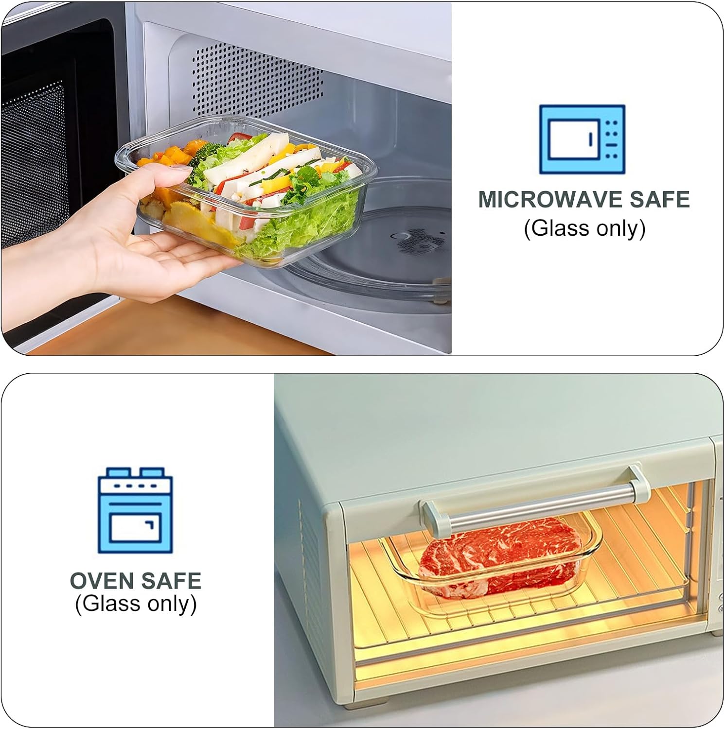 • HIGH QUALITY GLASS: Made from premium quality borosilicate glass, these glass meal prep containers are microwave, freezer, and oven safe, allowing you to conveniently heat up your meals, freeze leftovers, or even bake and reheat dishes, ideal for daily use. Please take off the lids when heating your meals.