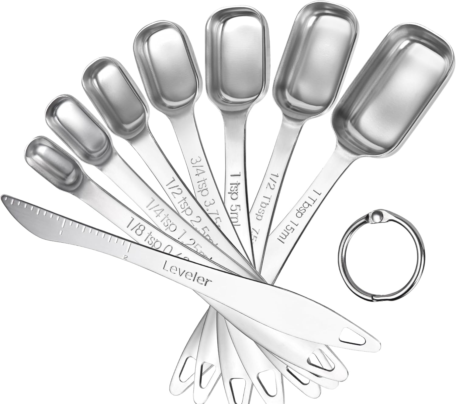 • Tired of guessing measurements while cooking? Each metal kitchen measuring spoon in this set features easy-to-read engraved US & metric measurements, ensuring you'll never have to guess to figure out the size. The engravings are deep and permanent, so they won't fade or wear off even after many uses and washes, providing accurate and consistent measurements every time you cook or bake.This set includes 1/8tsp、1/4tsp、1/2tsp、3/4tsp、1tsp、1/2Tbsp、1Tbsp and 1 leveler.