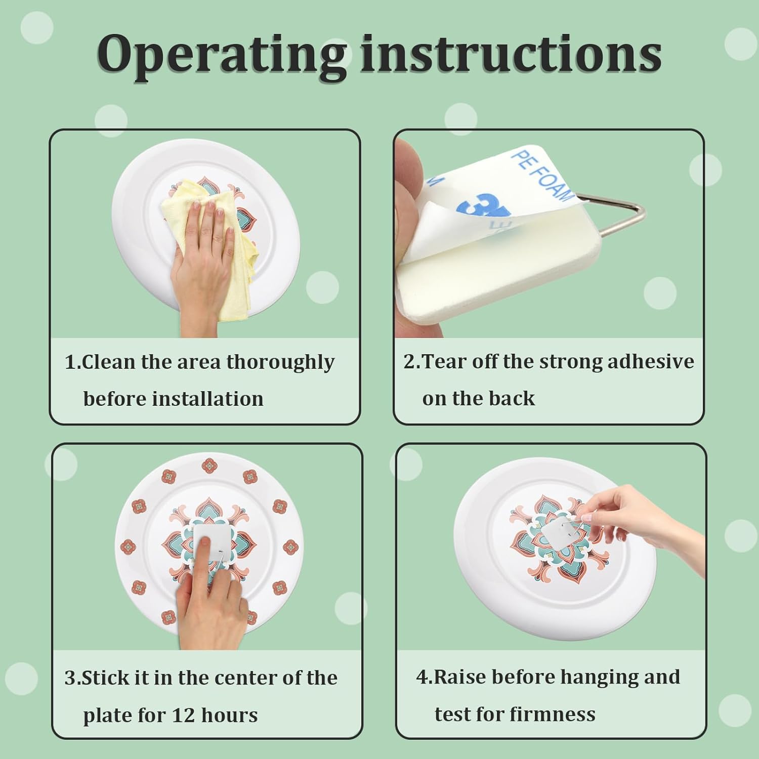 • Tips: Note that the adhesive size is 0.8 inches, so it's recommended not to hang heavy items. Multiple plate hangers can be used to reinforce the hanging effect.