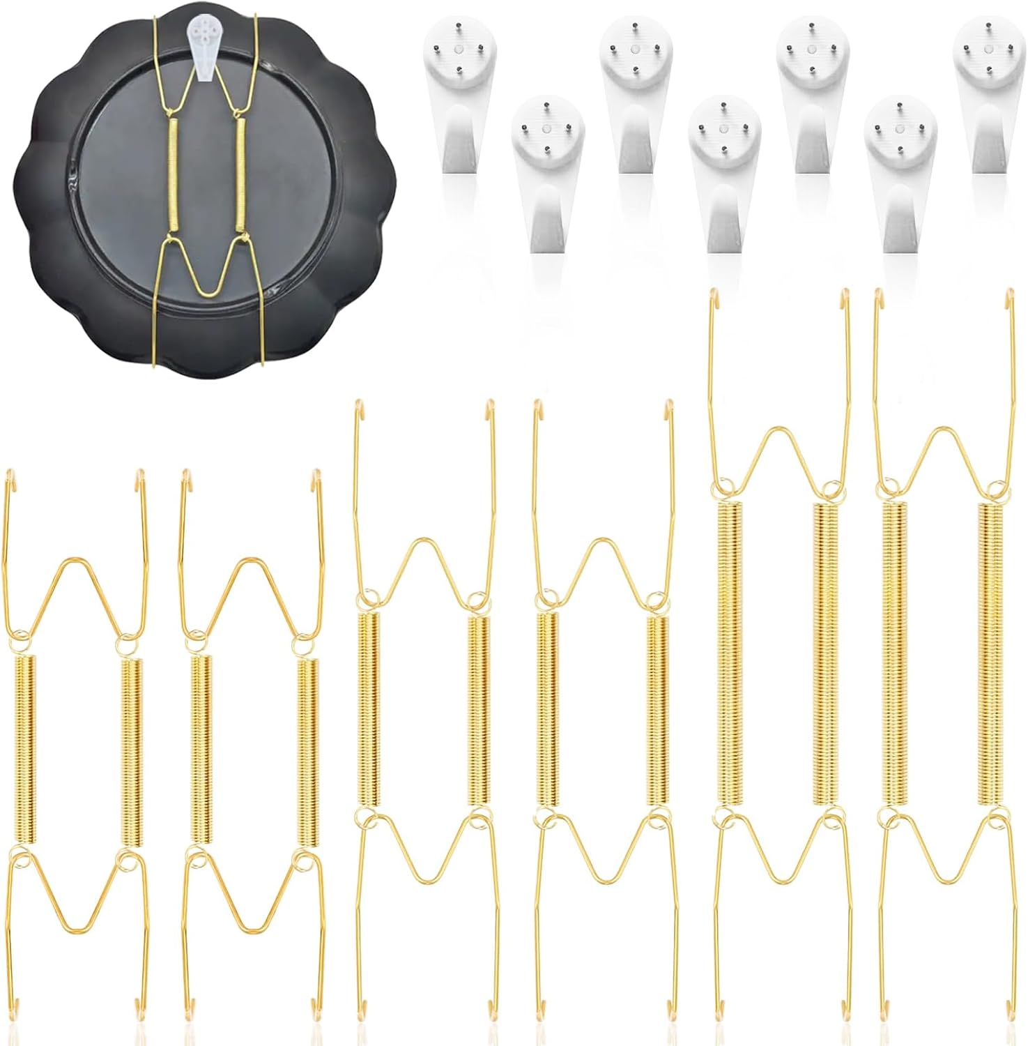 • 【Premium Material for Durability and Protection】: Made from high-quality stainless steel with a golden plating, these wall plate hangers are built to last, resisting rust and damage. The included clear rubber tip protectors prevent scratches on your precious plates, while the adjustable spring design ensures a secure hold.