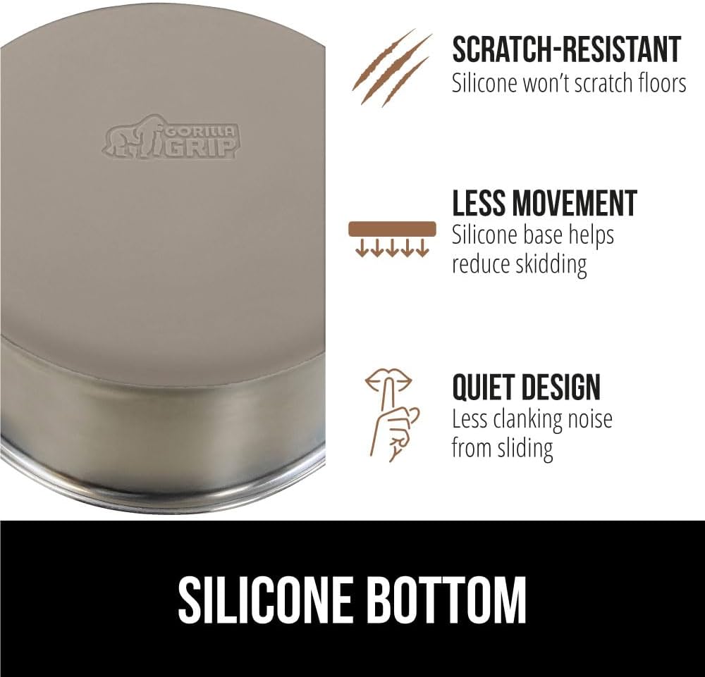 • SILICONE BOTTOM: the Gorilla Grip bowl is constructed from durable silicone that helps keep the bowl steady and won’t scratch your floors; while some over eager eaters may still be able to slide the bowls, the silicone will help prevent much movement; plus, it reduces the noise from clanking and sliding across wood, tile, and more