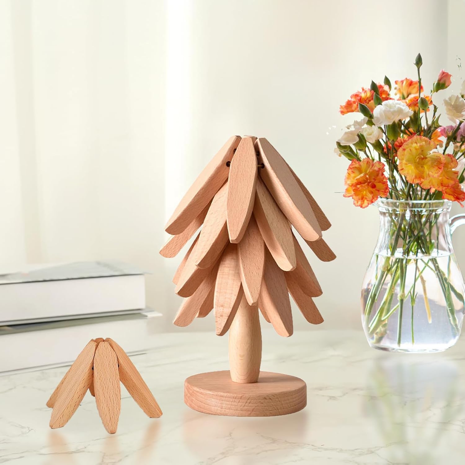 Wooden Trivets for Hot Dishes, Foldable Kitchen Trivet, Tree Shape Trivets Set - 4 Trivet & 1 Stand, for Hot Pots Pans, Teapots, Frying Pans, Decoration (Beech Wood)