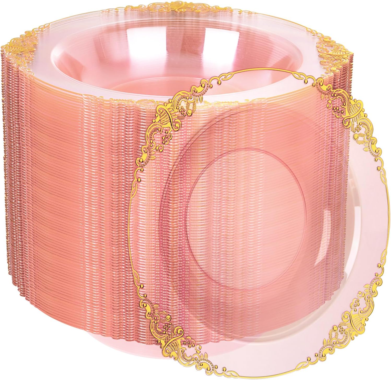 100PCS Clear Pink Plastic Bowls - 12 oz Pink Gold Disposable Salad Bowls - Heavy Duty Disposable Soup Bowl - Fancy Plastic Ice Cream Bowl for Weddings Parties Dinners Picnics