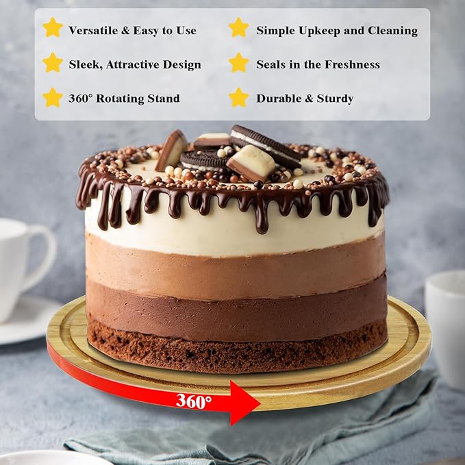 • 【Practical and beautiful】Rotatable cake serving tray brings sophistication to any decor,whether it's an indoor entertaining or an outdoor wine tasting party,you can use it to show off your food!Acacia wood grain is very delicate and beautiful, making it a perfect decoration for any occasion.