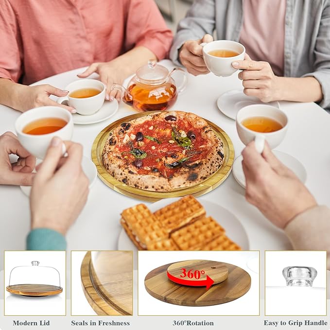 • 【PREMIUM MATERIAL】:Cake stand with lid is made of 100% natural acacia wood,100% food-grade,and thick acacia wood base ensures its durability.This cake stand with dome is different from others with glass dome,our acrylic cake dome is made of shatter-proof acrylic,This cake holder with lid has a certain amount of elasticity, Cake plates with lid is not as fragile as glass and is not easily broken