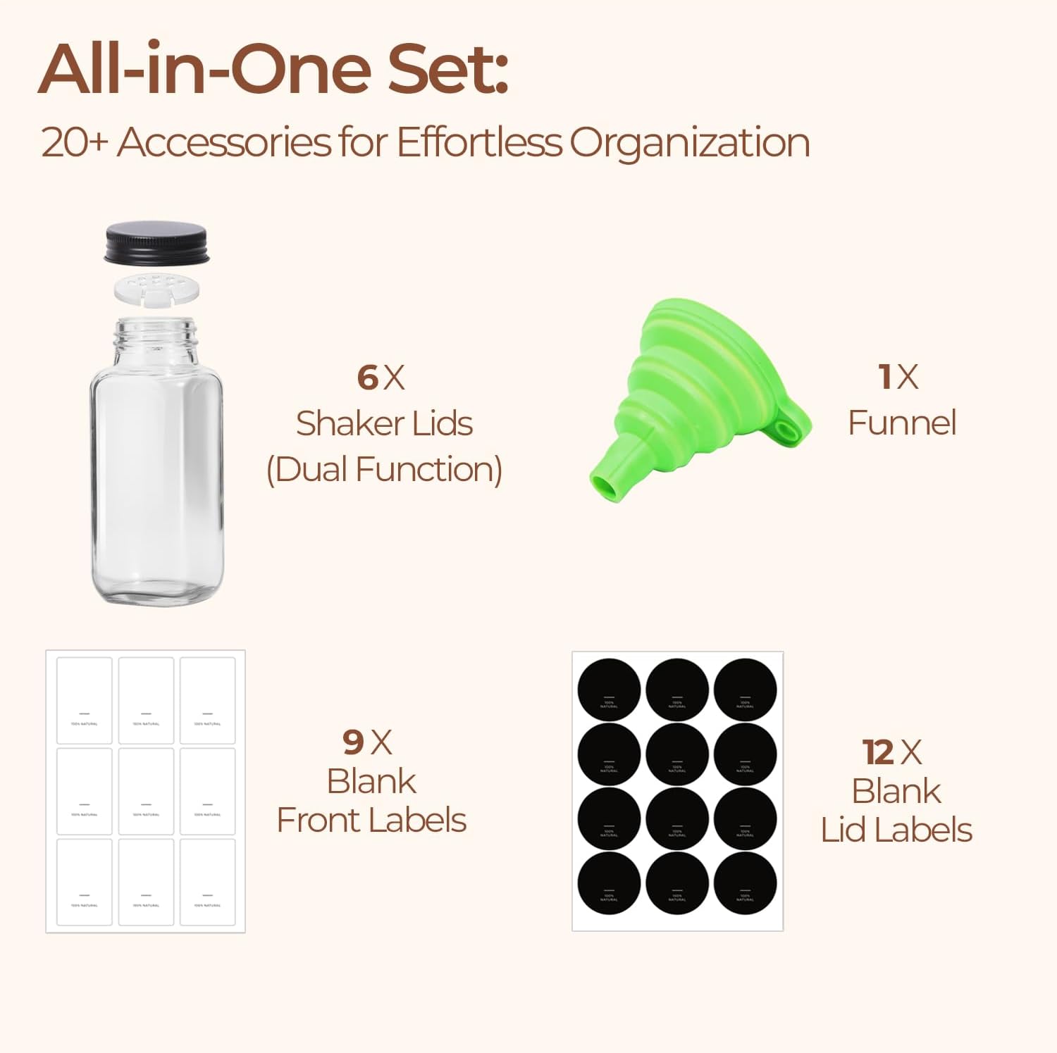 • Space-Saving Design: Maximize your kitchen's efficiency with our 6-piece set of 8 fl.oz spice jars. Designed to fit neatly on shelves and in drawers, transforming clutter into harmony.