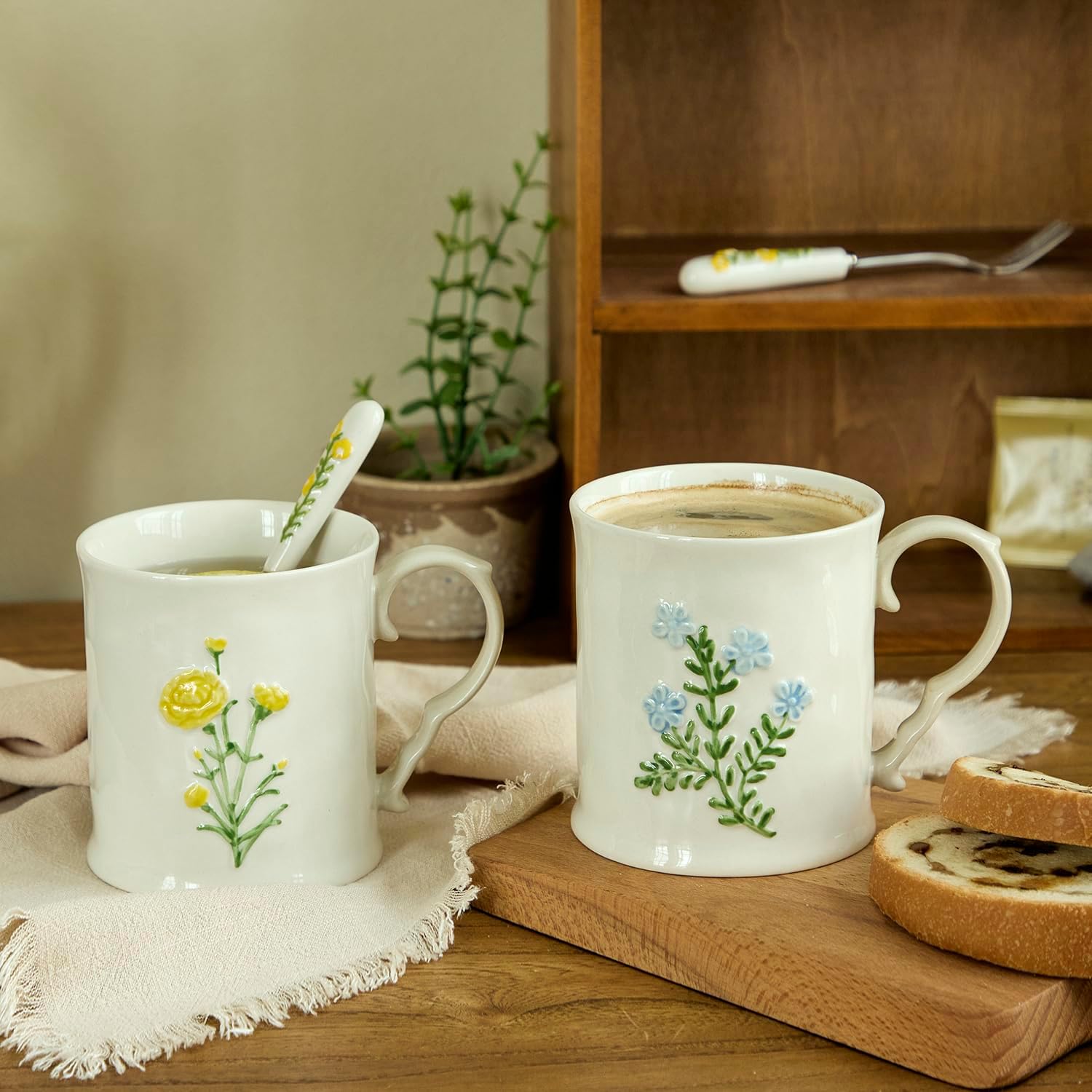 2 Pack Floral Ceramic Coffee Mugs - Yellow and Blue Flowers, Hand-Painted, Microwave & Dishwasher Safe, Ideal for Cappuccino, Tea, Hot Chocolate