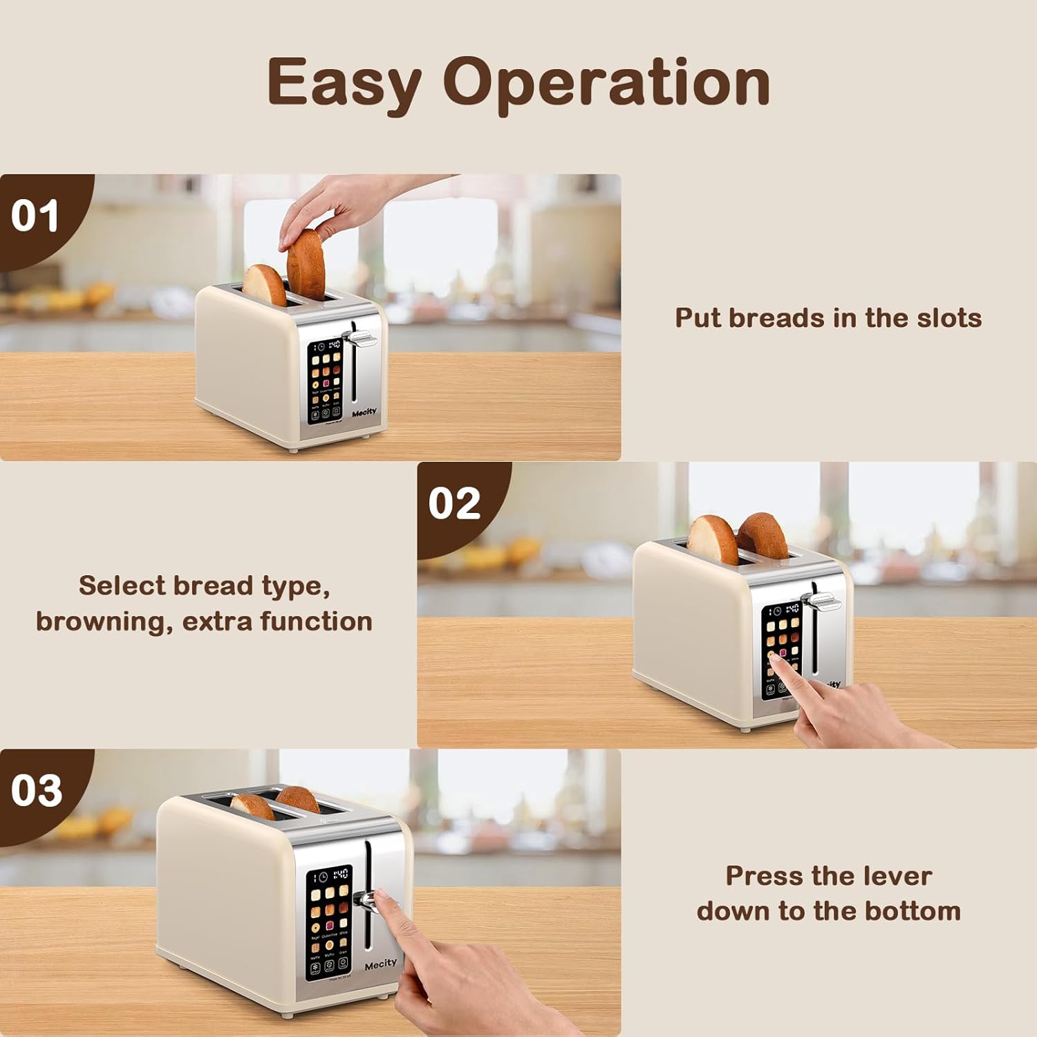 Mecity 2 Slice Touch Screen Toaster, 1.5" Wide Slot, Stainless Steel Smart Toaster for Bagels, Muffins, Waffles, Gluten-Free Breads, Defrost, Reheat, Timer, 120V 825W, Cream Color