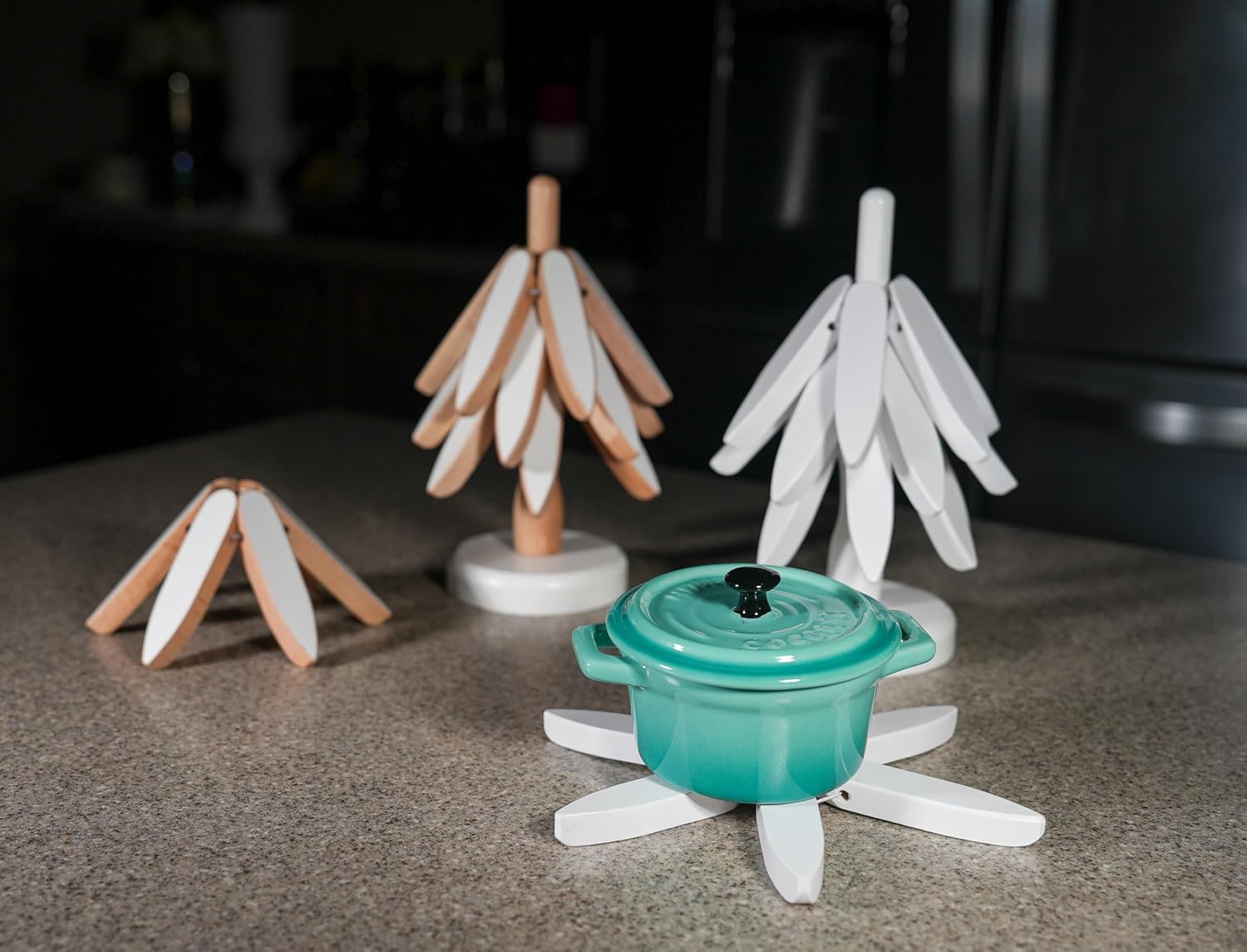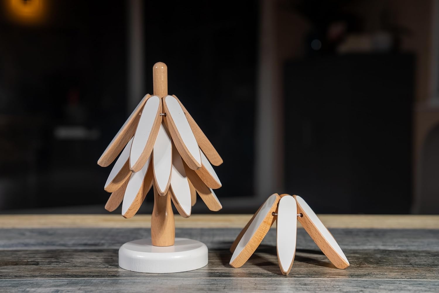 Wooden Trivets for Hot Dishes, Tree Trivet Set, Stackable Tree Coasters for Hot Dish, Pot, Bowl, Teapot, Includes 4 Trivets, 1 Stand, and 4 of Choice (White/Natural Wood)