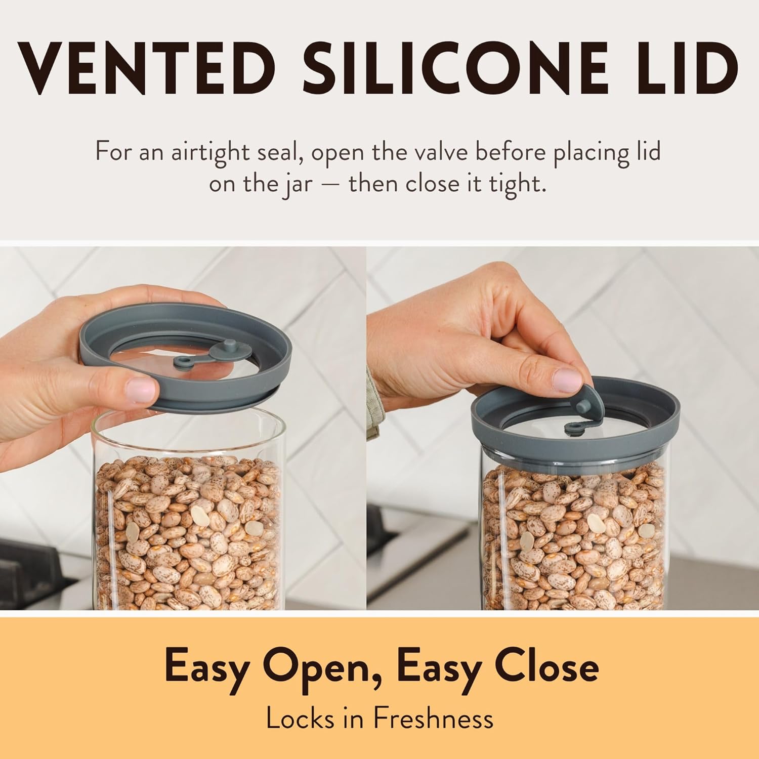 • Exclusive Vent Design Locks in Freshness: A proprietary venting design on the silicone cover locks in freshness; Simply “pop” open the valve before placing the lids on your canisters and close valve to store pasta, snacks and flour without moisture