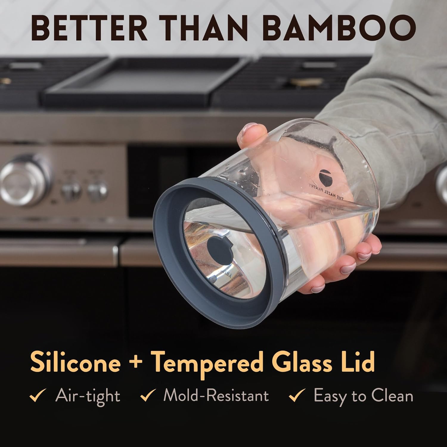 • Silicone Lid Superiority: Silicone lids take up less space than bamboo inside the container for extra storage, are airtight, won’t damage glass taking them on and off, and are non-slip with raised borders making them stackable for kitchen organization