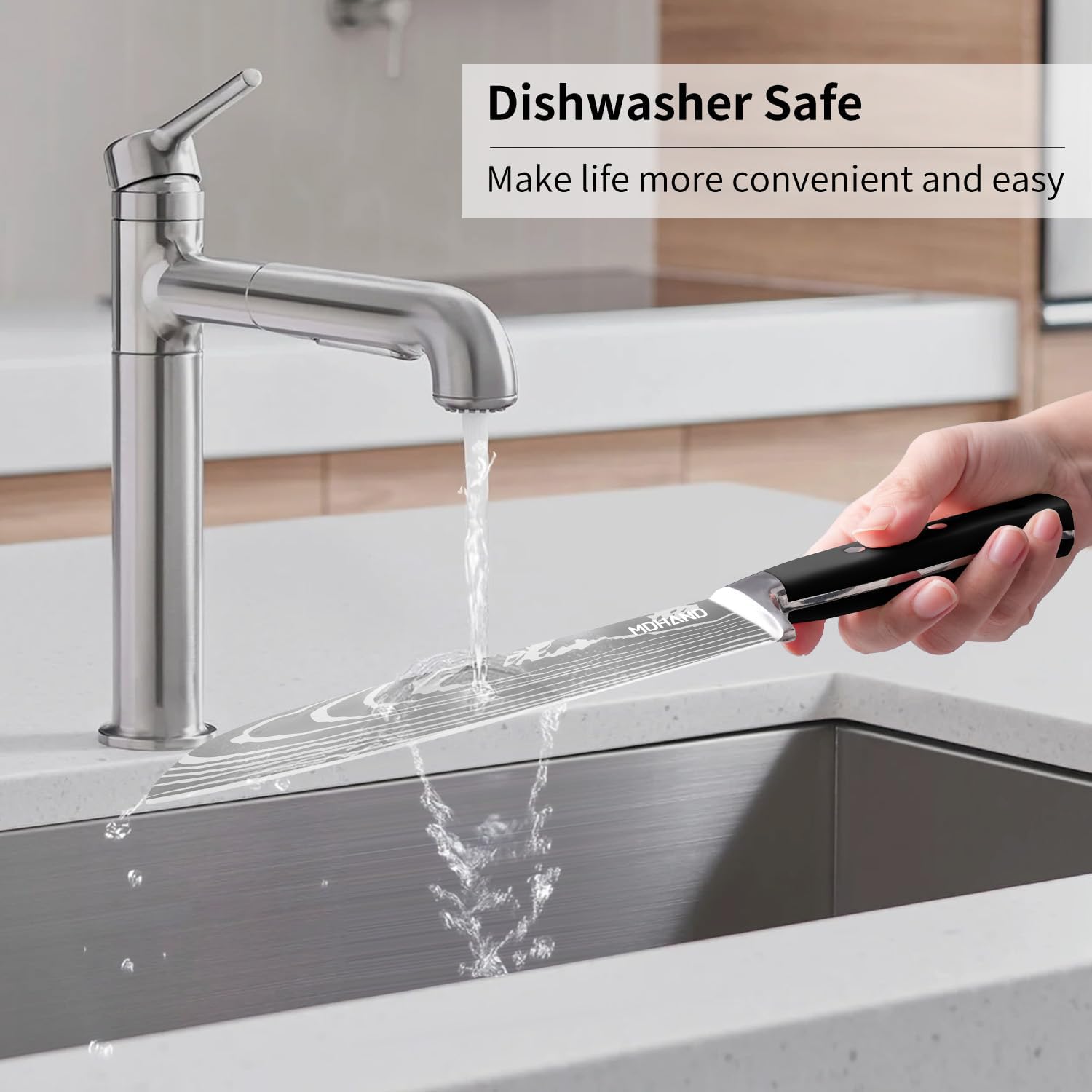 • 🔪【NON-STICK & RUST RESISTANT】The Knife Set blade has a laser pattern that prevents stainless steel from oxidizing, and the use of the kitchen knife set will last for a long time and remain non-stick and rust-proof.