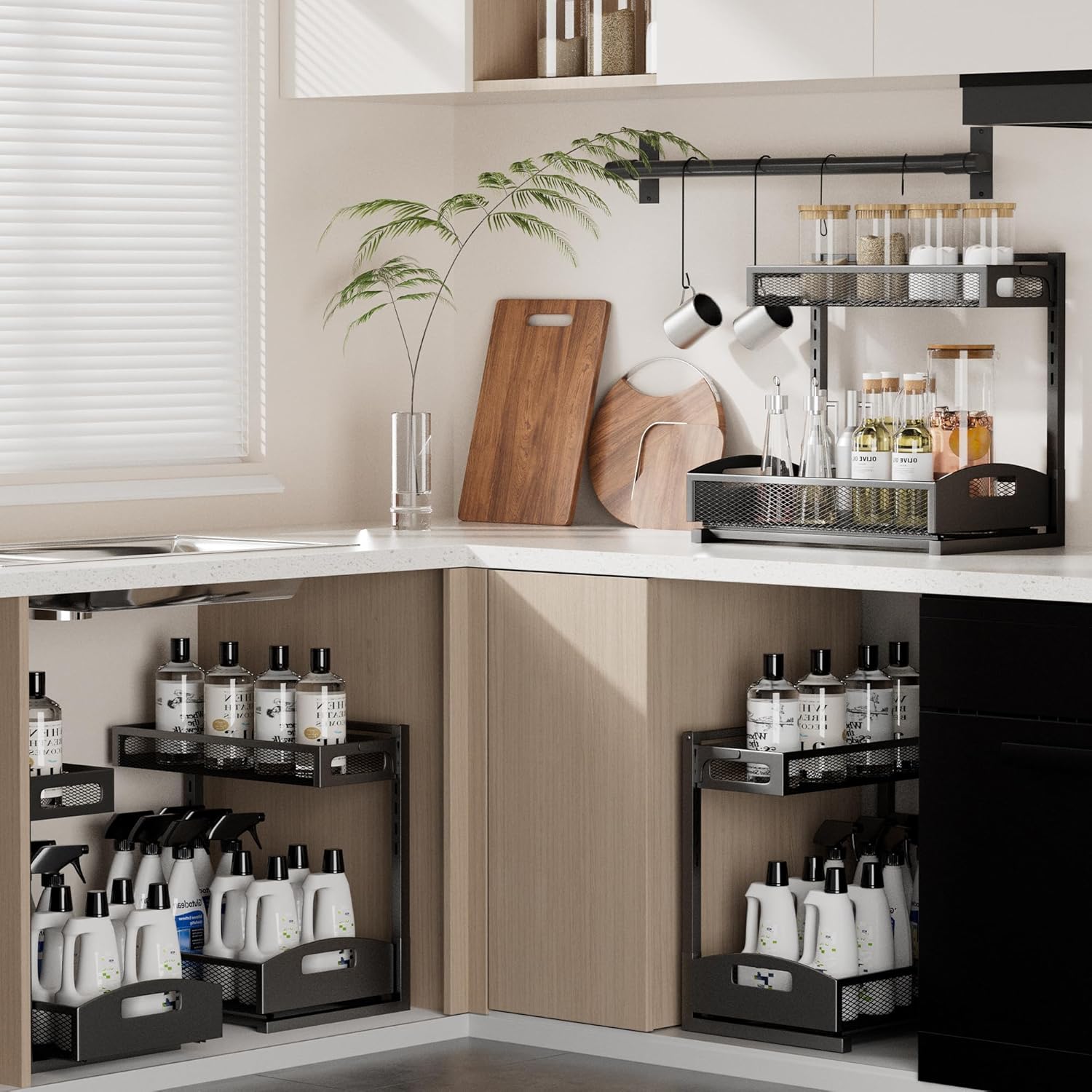 • L Shaped Space Saving: L-shaped design with narrow top and wide bottom, leaves space for plumbing and garbage disposal, maximizing the vertical space of the sink. And the bottom tier leaves a suitable space for your tall bottles, which can solve your cabinet storage troubles。