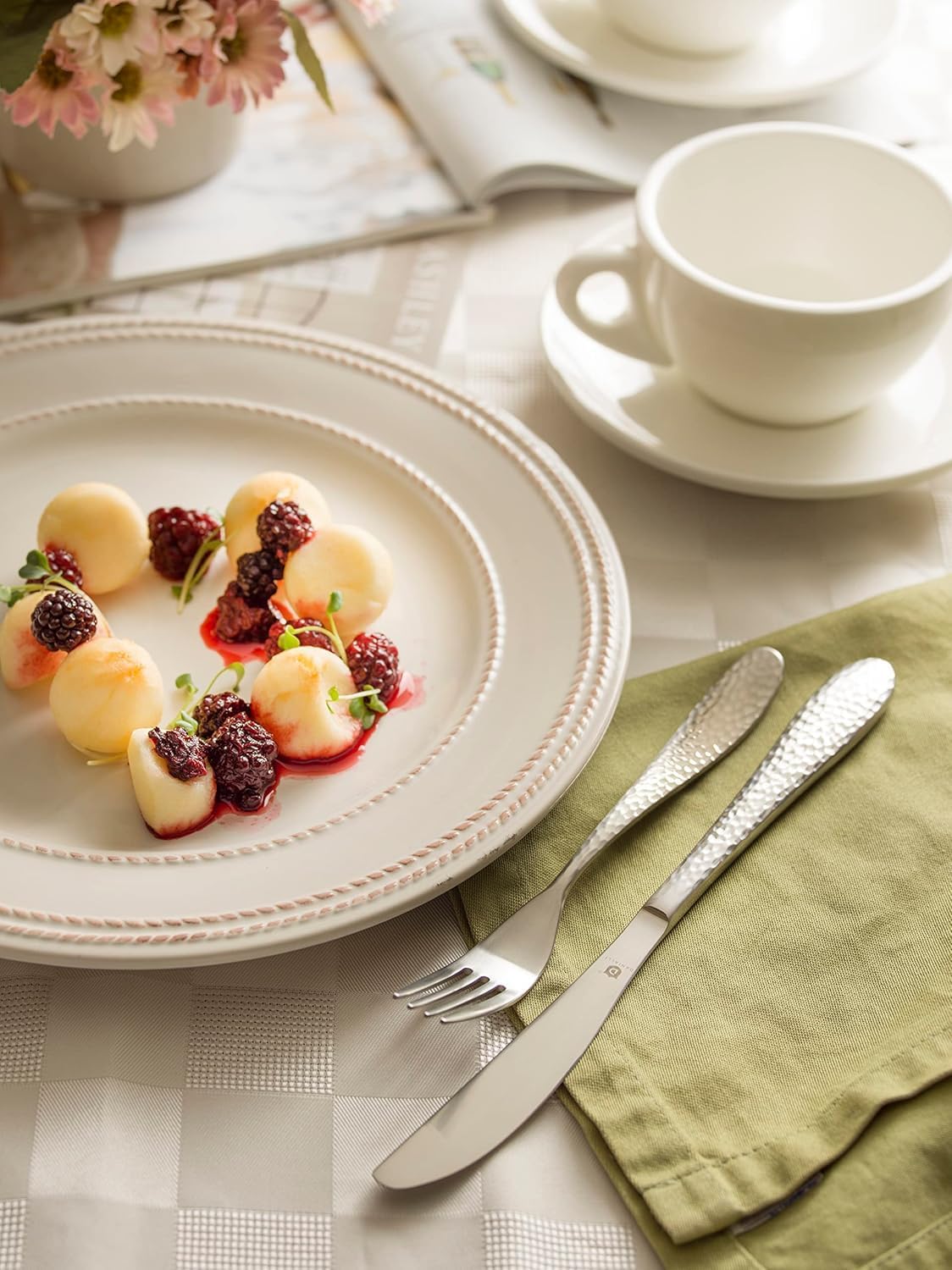 • Complete Matte-Hammered Silverware Set for 8 – Includes 8 dinner knives (9 1/8”), 8 dinner forks (8”), 8 salad forks (7 2/8”), 8 tablespoons (8”), and 6 teaspoons (7 3/8”) – thoughtfully sized for everyday meals and special occasions.