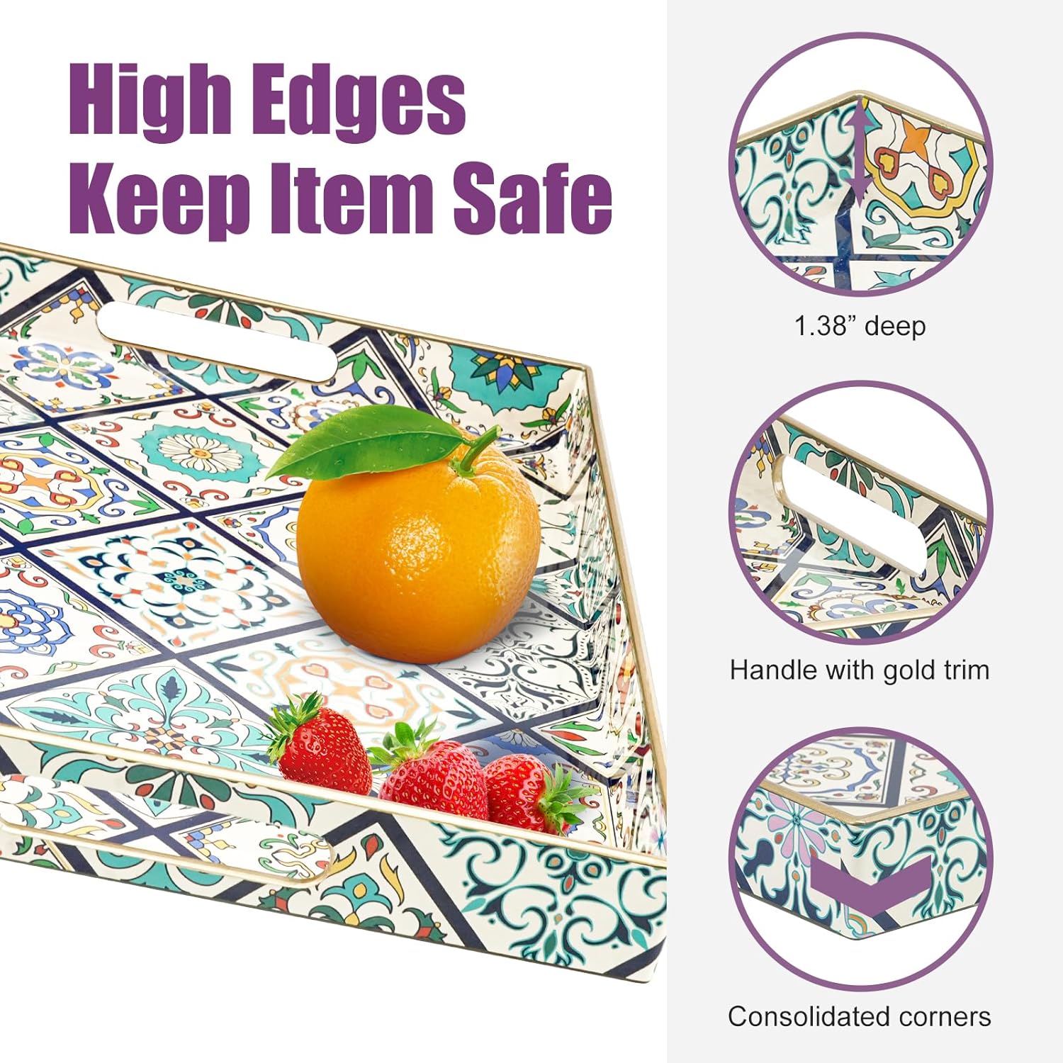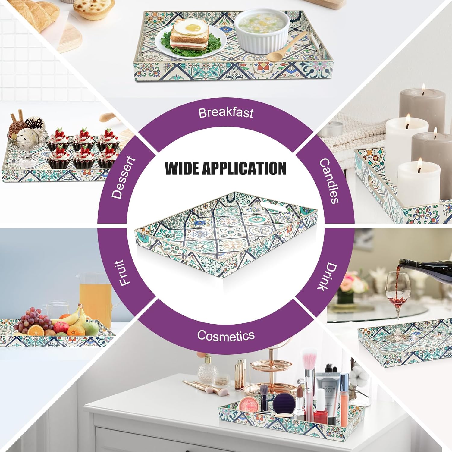 • 【Multipurpose Serving Trays】Designed for display and storage, this floral boho serving tray can be used as a decorative tray, makeup tray, jewelry tray, service tray and desktop organization tray.This serving tray can also be used as a storage box for small items such as keys or TV remote controls. Also perfect for serving snacks, breakfast lunch or dinner.