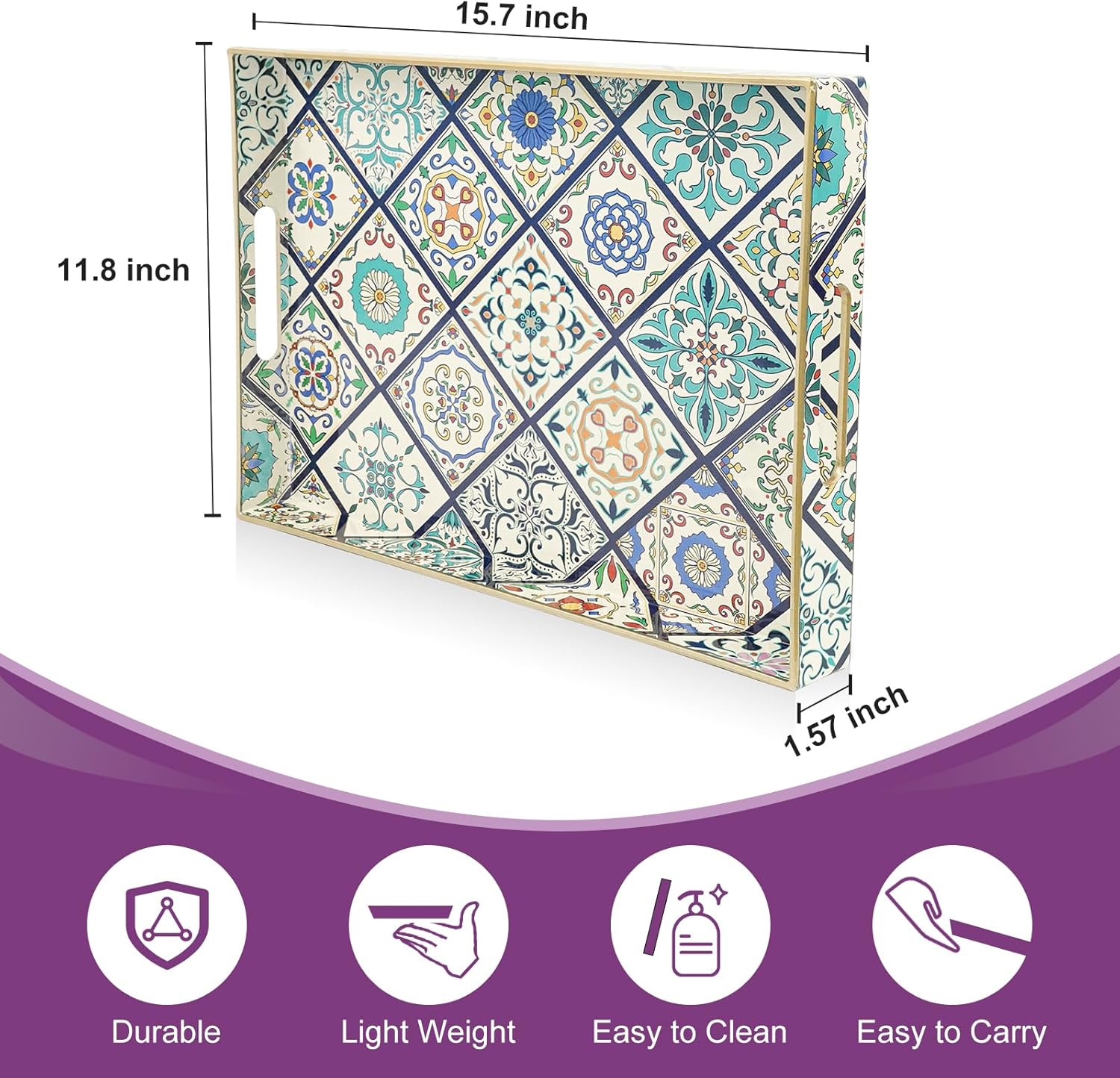 • 【Serving tray size】15.7x 11.8x 1.57 inches, each handle size 3.94 inches, 2 built-in handles with gold trim for easy movement or carrying. The serving tray with handles feel fine and smooth, the edges are also relatively smooth, not easy to damage and easy to maintain balance.