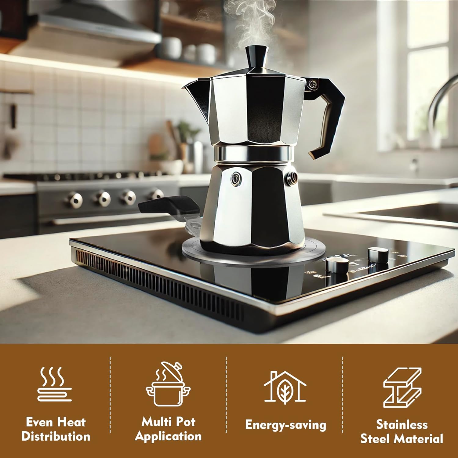 • Also Compatible with Moka Pot:Using the The induction hob heat diffuser allows for even heating, preventing coffee from boiling too quickly and reducing the risk of rapid pressure buildup, which effectively minimizes overflow and splattering. Brewing coffee with a heat diffuser provides better temperature control, ensuring optimal extraction while avoiding bitterness or burnt flavors, ultimately enhancing the overall taste of the coffee