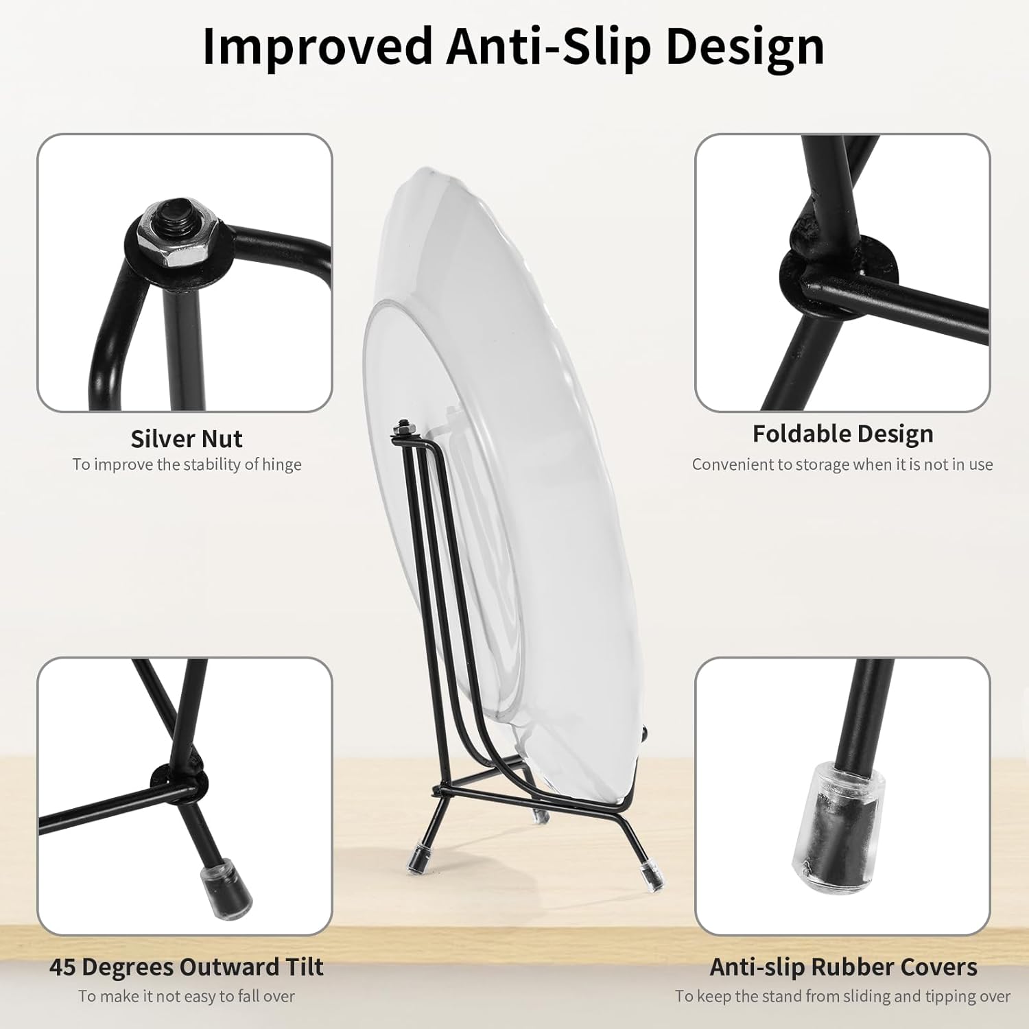 • HIGH QUALITY & FOLDABLE DESIGN: This Plate Display Stand is made from durable and high-quality black coated iron. Stable shape, anti-aging and long service life. This Plate Holder can fold into flat for easy carry and convenient storage when it is not in use. Appropriate for home, office, bookstore or showroom use.