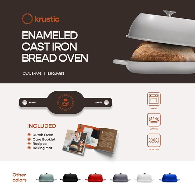 • PERFECT BAKING: Krustic professional dutch oven for bread baking features an innovative dome design that creates optimal steam circulation, helping your sourdough to achieve the perfect rise and golden crust every time. The specially engineered with 5.5-quart capacity and precise temperature control make this cast iron cookware essential for both novice bakers and seasoned professionals.