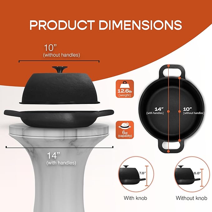 • ULTIMATE DUTCH OVEN SET: Krustic enameled cast iron Dutch oven brings a game-changing innovation to your kitchen! Measuring 14" in diameter with handles, 10" without handles, 7.8" high with the knob, and 6.8" without the knob and weighing 12.6 lbs, this 6 quart pot with lid is a perfect size to create your culinary masterpiece. Our bread oven includes a non-stick, easy-to-clean, dishwasher-safe silicone mat sized 21.4" x 8.2", a care manual, and a homemade recipes book.