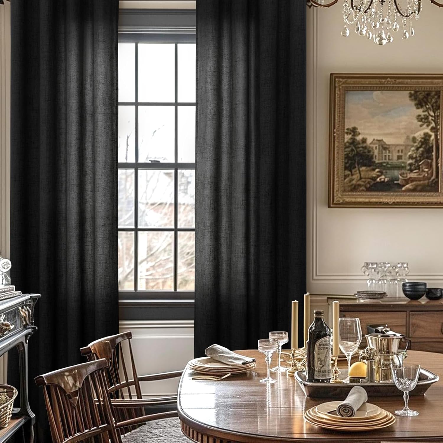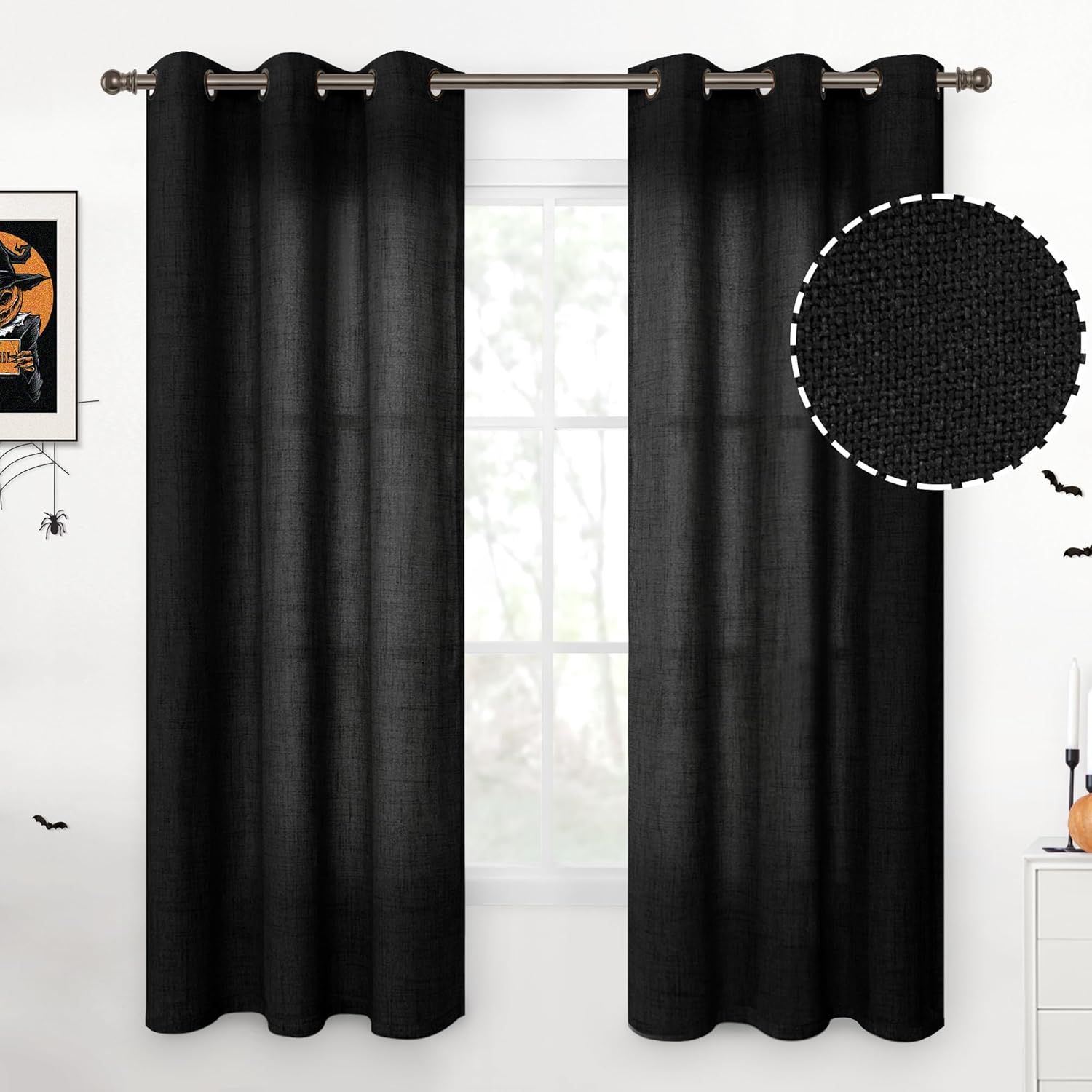 YoungsTex Black Linen Curtains 63 Inches Length for Living Room, Semi Sheer Drapes with Bronze Grommet Light Filtering Privacy for Bedroom Gothic Decorative, 42 x 63 Inch, 2 Panels