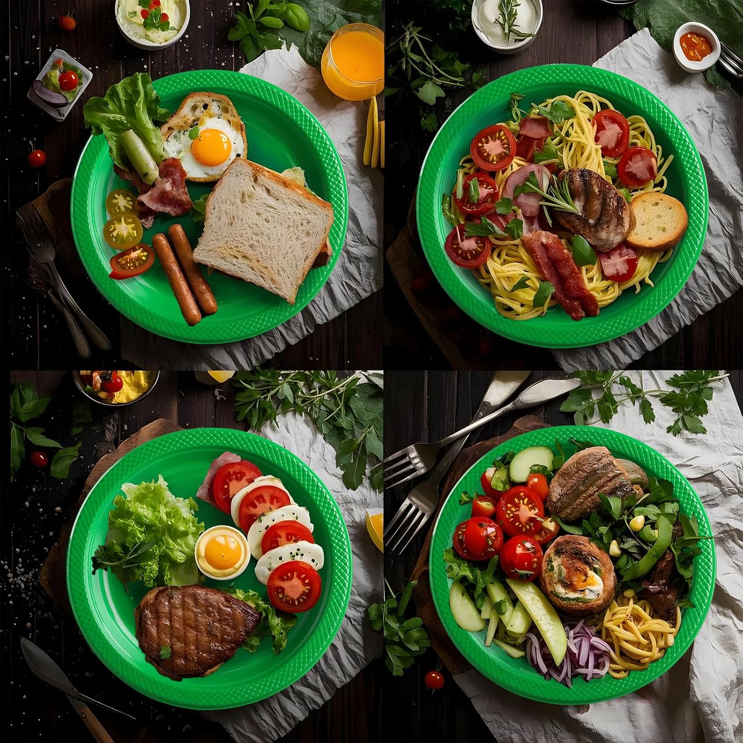 • PREMIUM QUALITY:We made our green plastic plates disposable with you in mind.Our green plates disposable are made of food grade materials and can be used with confidence.They are tough enough to hold a lot of food. These green party plates are solid, durable and won't scratch or break easily