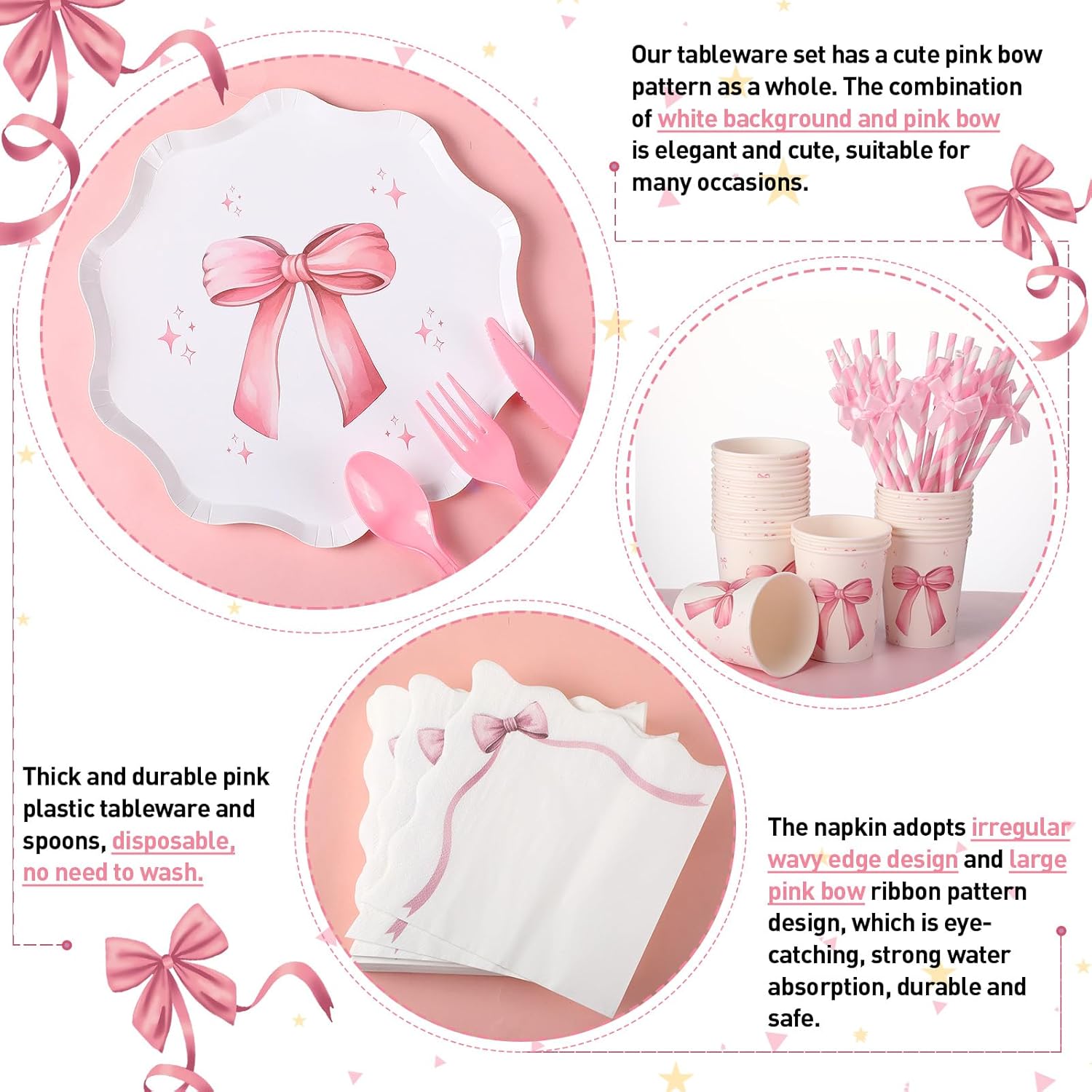 • Pink Bow Party Dinnerware Supplies Set: our package will cater to 25 guests, featuring 25 each of 9 inch plates, 7 inch plates, cups, napkins, forks, spoons, knives, and straws, 1 elegant banner, 1 table cloth, which will make your party decorations are fully covered