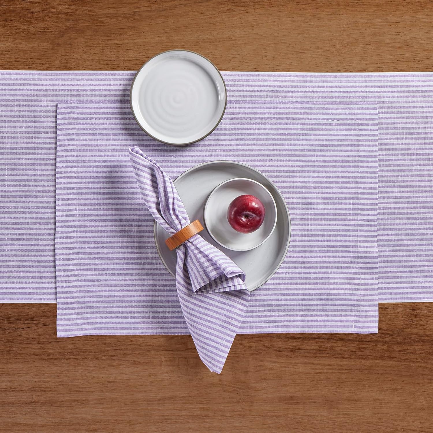Solino Home Linen Striped Table Runner 132 Inches Long - Narrow Stripe 100% Pure Linen Lavender and White Dining Table Runner 14 x 132 Inch