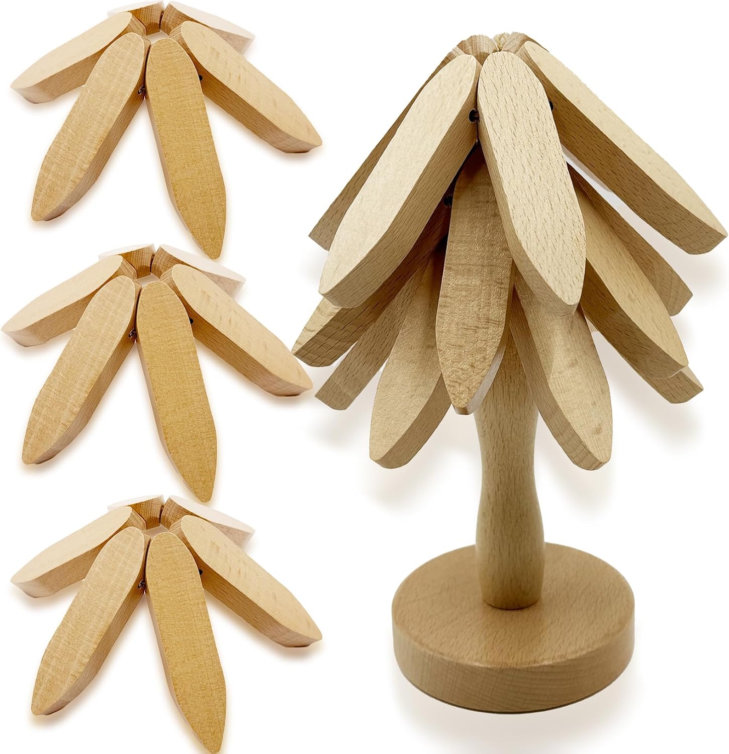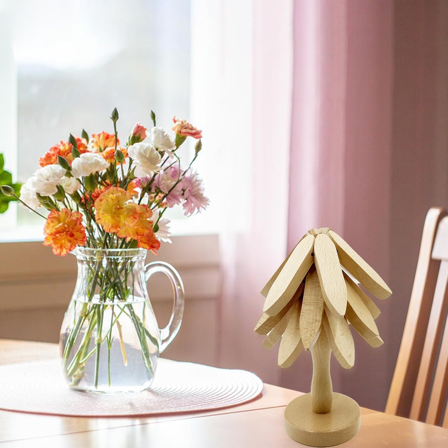 • Unique Tree-Shaped Design: These wooden trivets feature six small pieces; simply take one from the bracket and place it on the table - no need to flatten it beforehand; when placing a hot dish on top, gravity helps it automatically unfold and provide its intended function