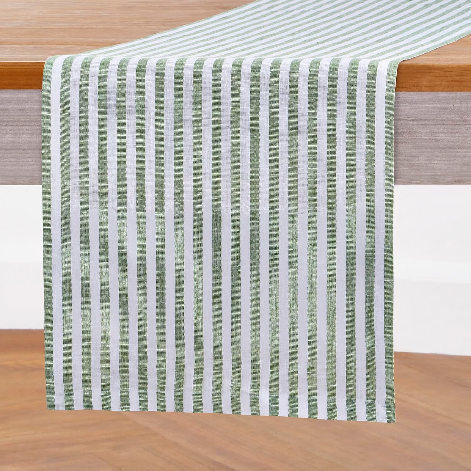 Solino Home Linen Table Runner 90 Inches Long - Amalfi Stripe, 100% Pure Linen Green and White Table Runner 14 x 90 Inch for Dining, Fall, Autumn, Christmas