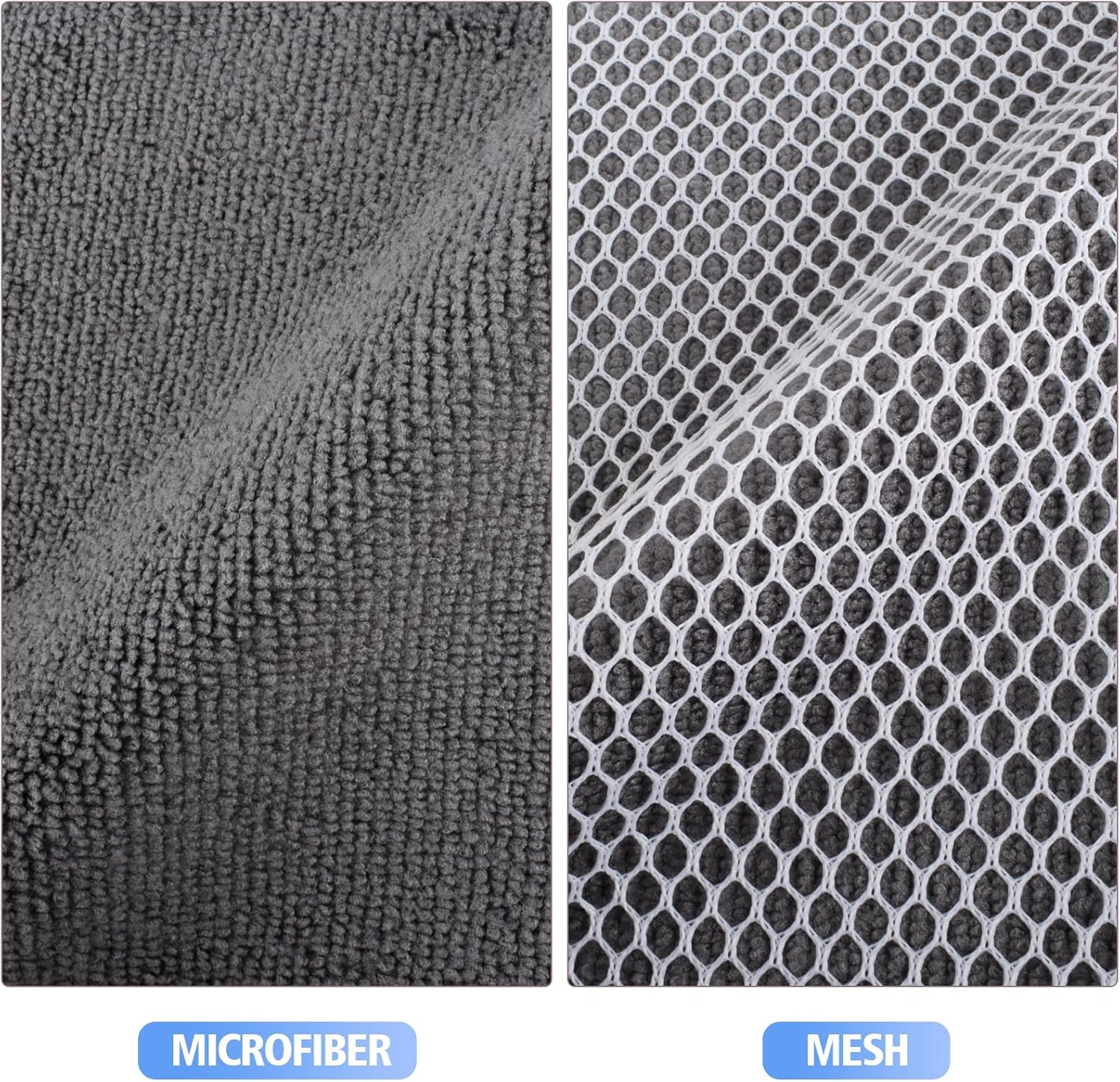 • DISH RAGS FOR KITCHEN CLEANING WITH POLY SCOUR SCRUBBING SIDE: One side is microfiber and the other side is mesh. The microfiber side works well at getting finger spots off the stainless steel appliances and the glass front of fridge or stove, microwave; the scrubby side is good for cleaning stuck on food without having to grab your scraper and does not scratch delicate surfaces either