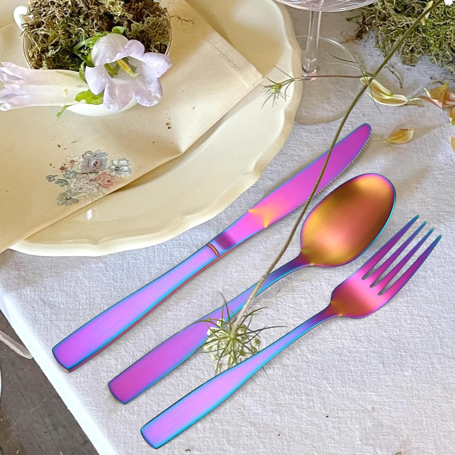 • Matte Finish: Add a touch of color and elegance to your dining experience with this set of rainbow stainless steel matte silverware. The matte finish adds a modern and sleek look to your table setting.