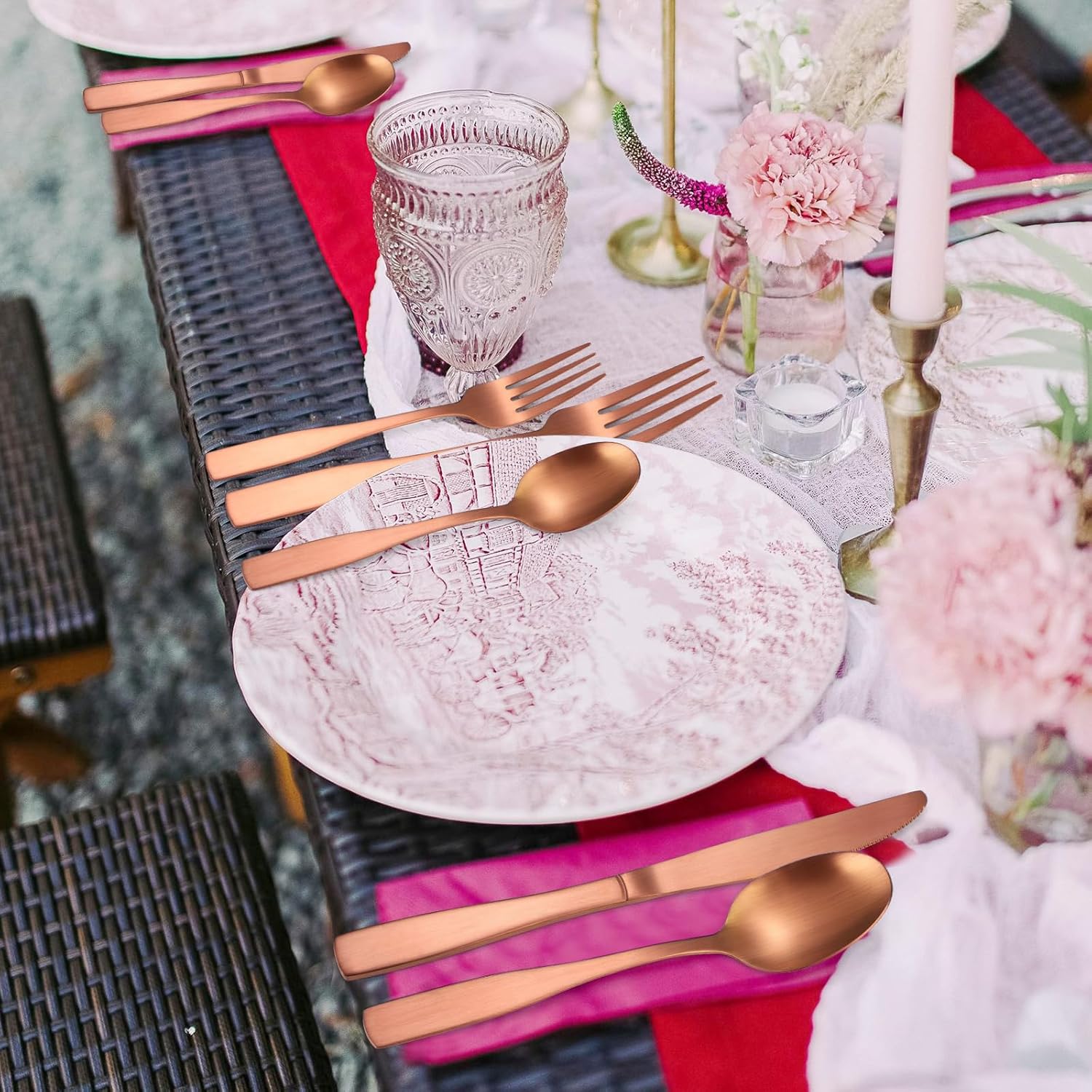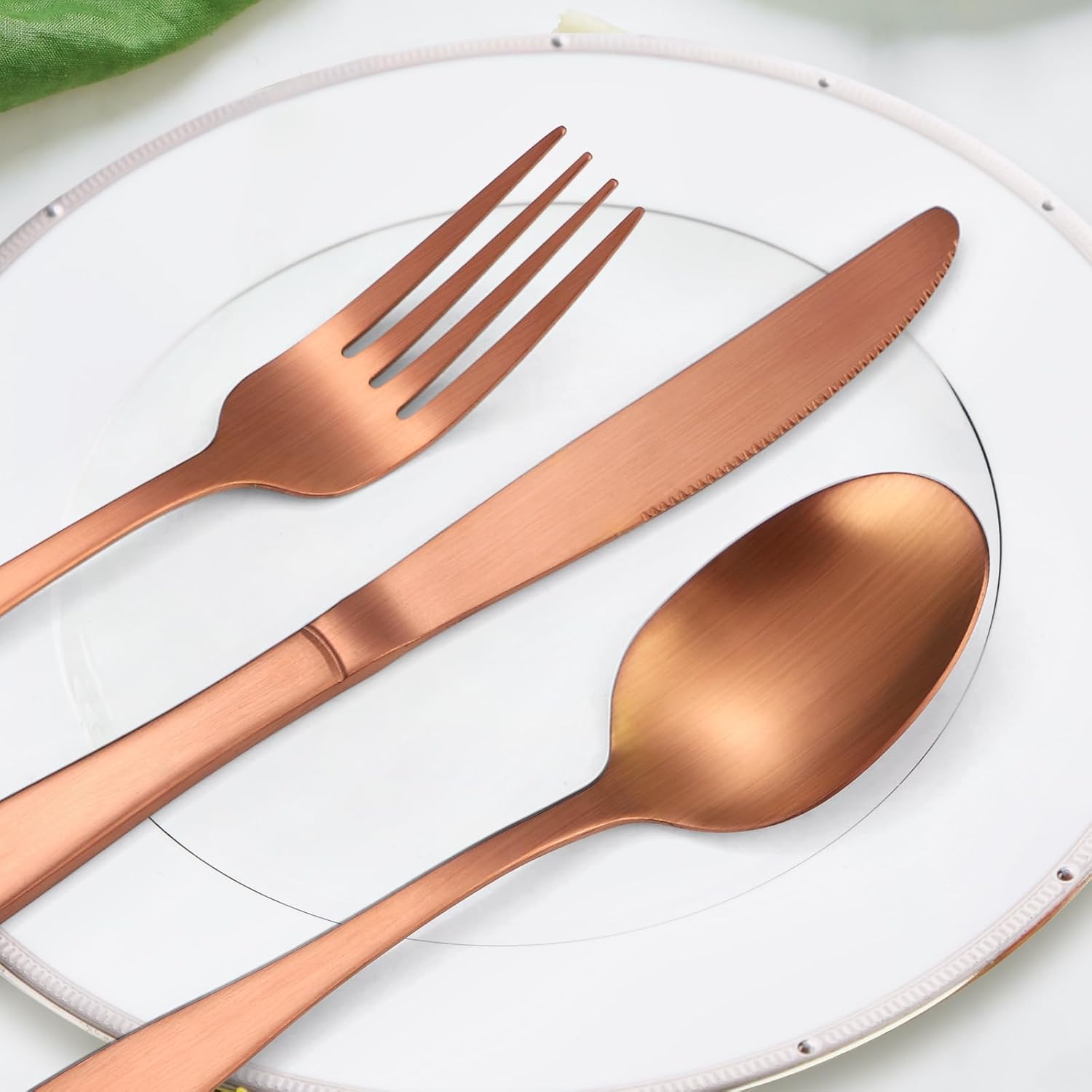 • Elegant Design: This 30-piece flatware set features a sleek rose gold matte finish that adds a touch of sophistication to any dining experience.