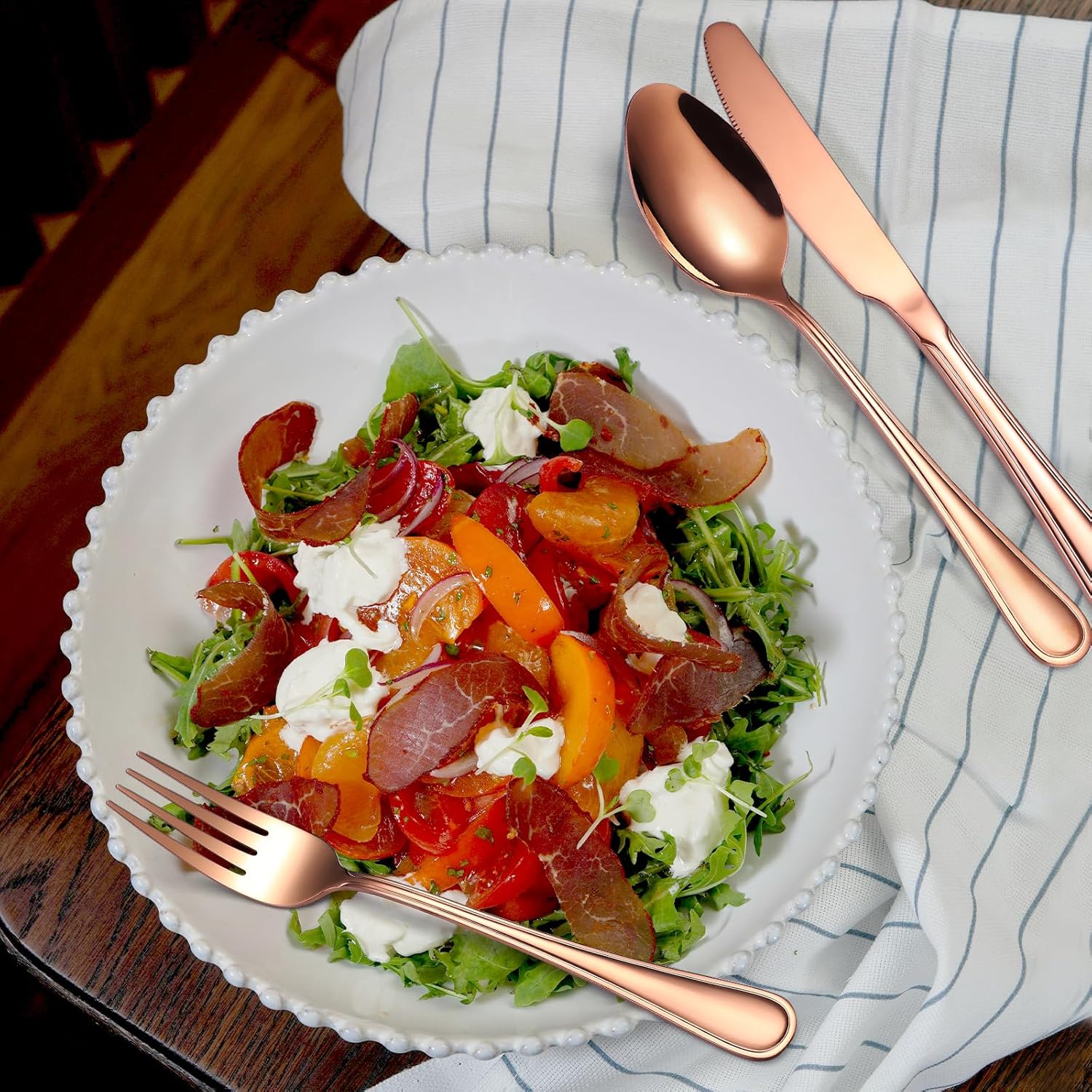 • QUALITY STAINLESS STEEL: Elevate your dining experience with this elegant rose gold flatware set, designed specifically for a party of four. Crafted from high-quality stainless steel, these utensils are durable, stylish, and sure to impress your guests.
