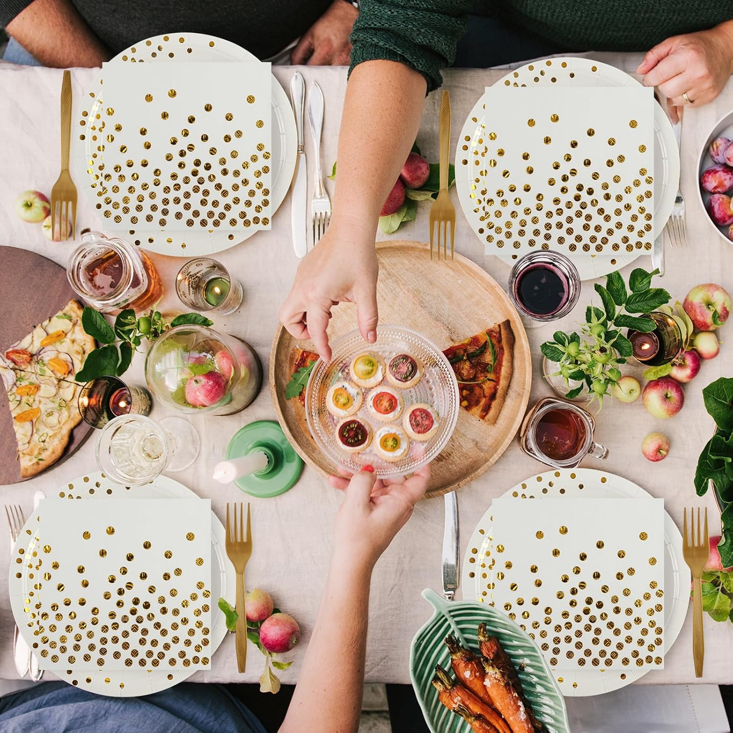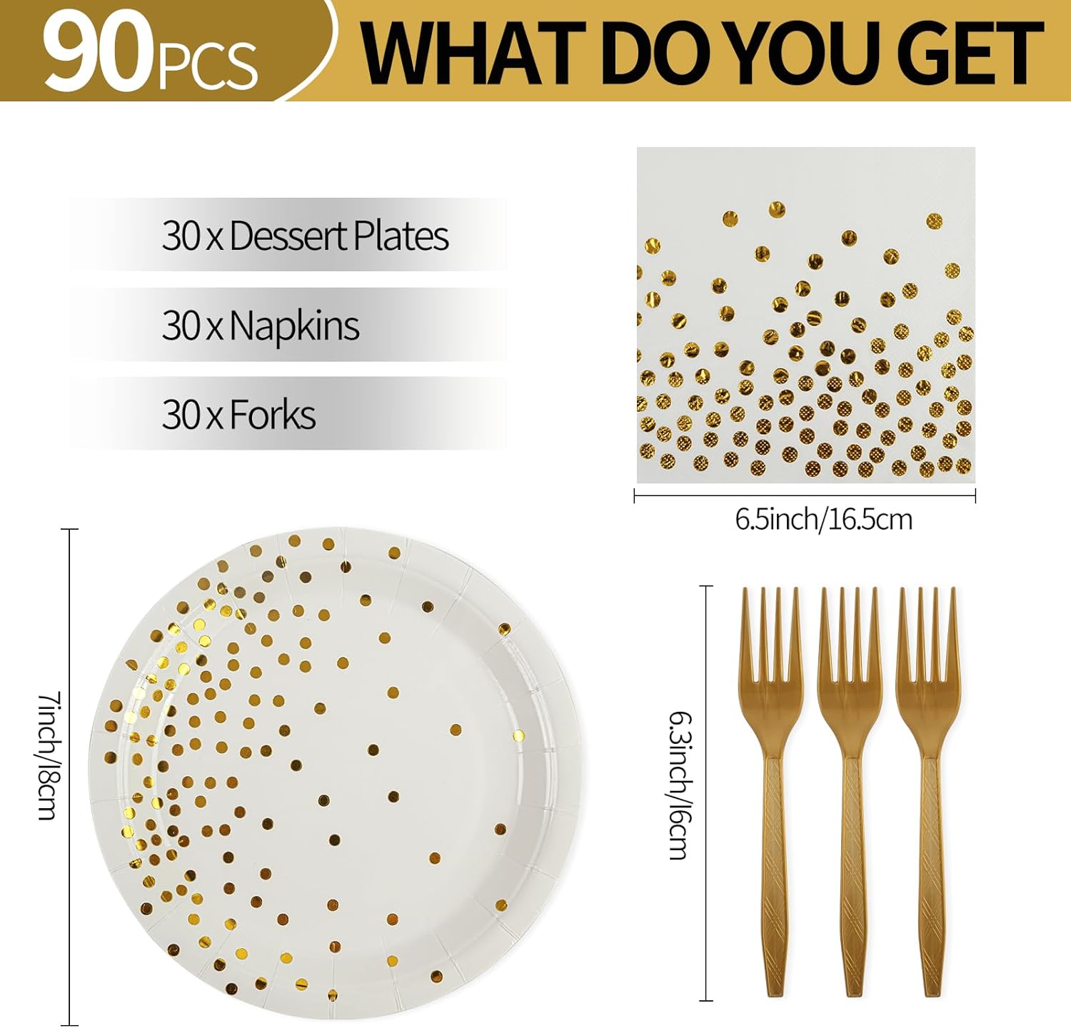 90PCS White and Gold Paper Plates and Napkins Set, Disposable Gold Dot Party Plates with Napkins Forks Dessert Dinnerware Party Supplies for Wedding, Graduation, Festivals