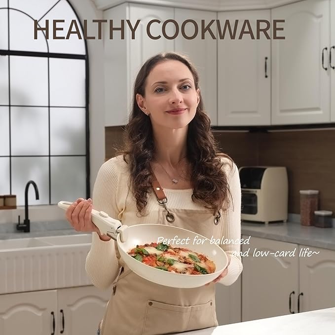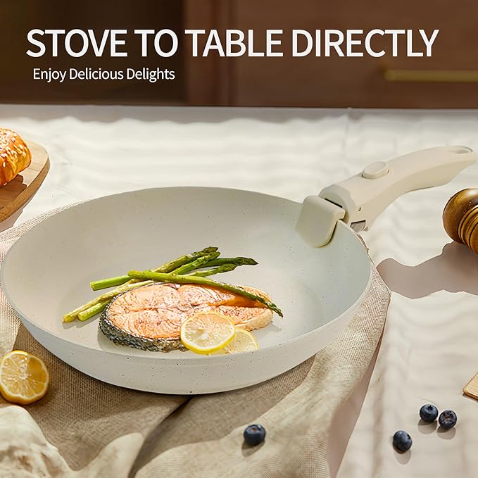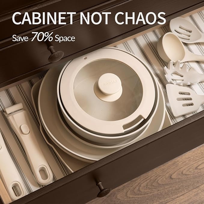 • 4. Stackable and Compact: Save up to 75% more space with stackable pots and pans set and detachable handles, allowing for storage in cabinets or RVs.