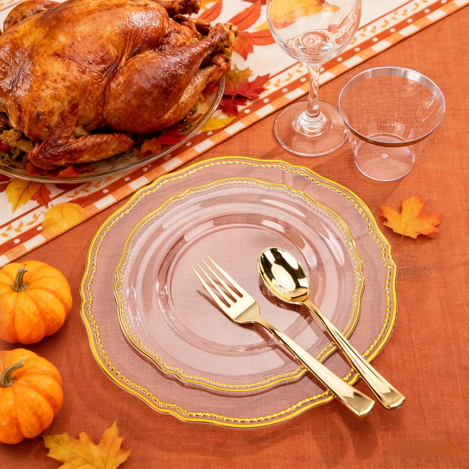 Hioasis 350pcs Clear Gold Plastic Plates - Gold Plastic Dinnerware Set Includes 50 Dinner Plates, 50 Dessert Dinnerware, 50 Cups, 50 Rolled Napkin Cutlery Perfect for Wedding & Party