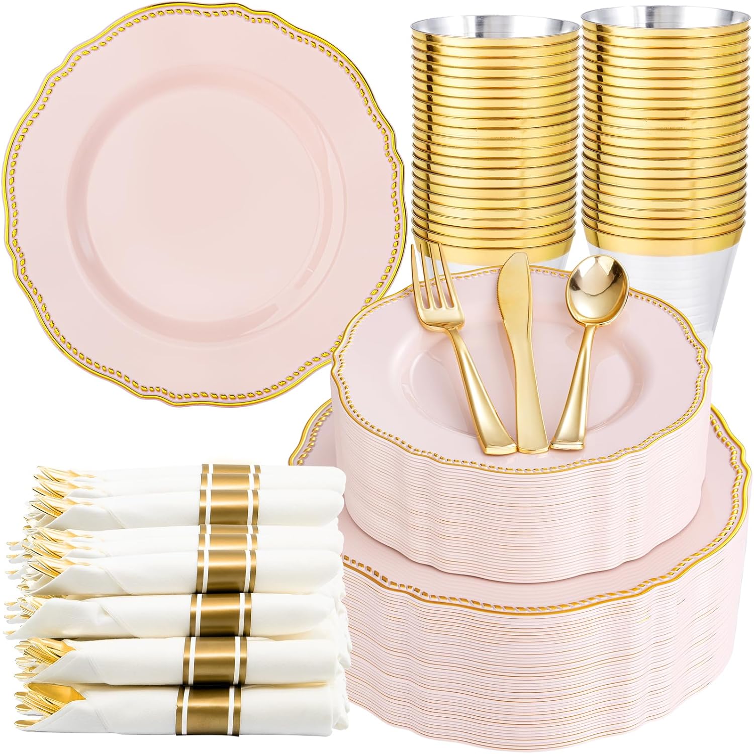 • Complete Set: This 350-piece pink and gold dinnerware set includes everything you need to serve 50 guests: 50 pink and gold dinner plates, 50 pink and gold dessert plates, 50 gold knives, 50 gold forks, 50 gold spoons, 50 clear cups with gold rim, and 50 rolled napkin cutlery. These heavyweight party plates can hold any type of food, perfect for picnics and holiday gatherings. The matching gold dinnerware set adds an exquisite touch to your events.