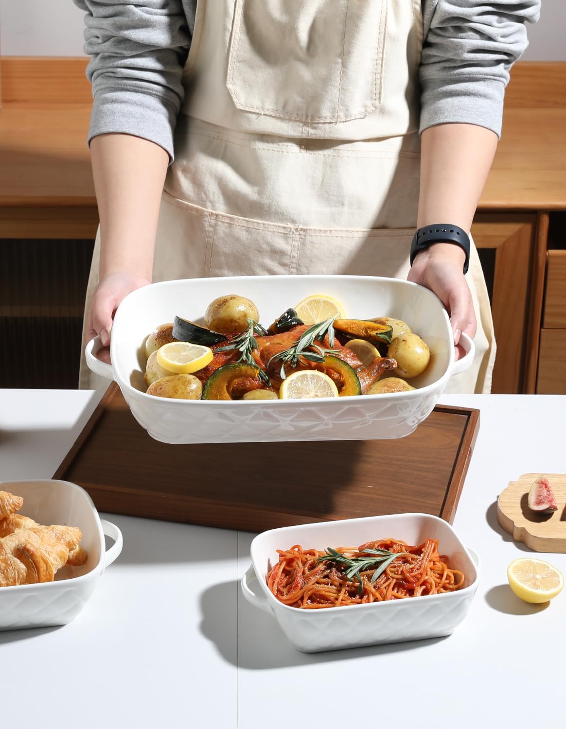 • 【MEET ALL BAKING NEEDS】The ceramic baking dishes set made of safe materials, suitable for heating and storage of bread, pasta, casseroles, lasagnas, roasts, chicken, barbecue, beef, vegetable food, to meet your different needs.