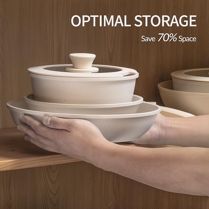 • 4. Stackable and Compact: The non stick pots and pan set ceramic cookware include ceramic frying pan with lid Save up to 75% more space with stackable pots and pans set and detachable handles,ceramic pans and ceramic pots allowing for storage in cabinets or RVs.