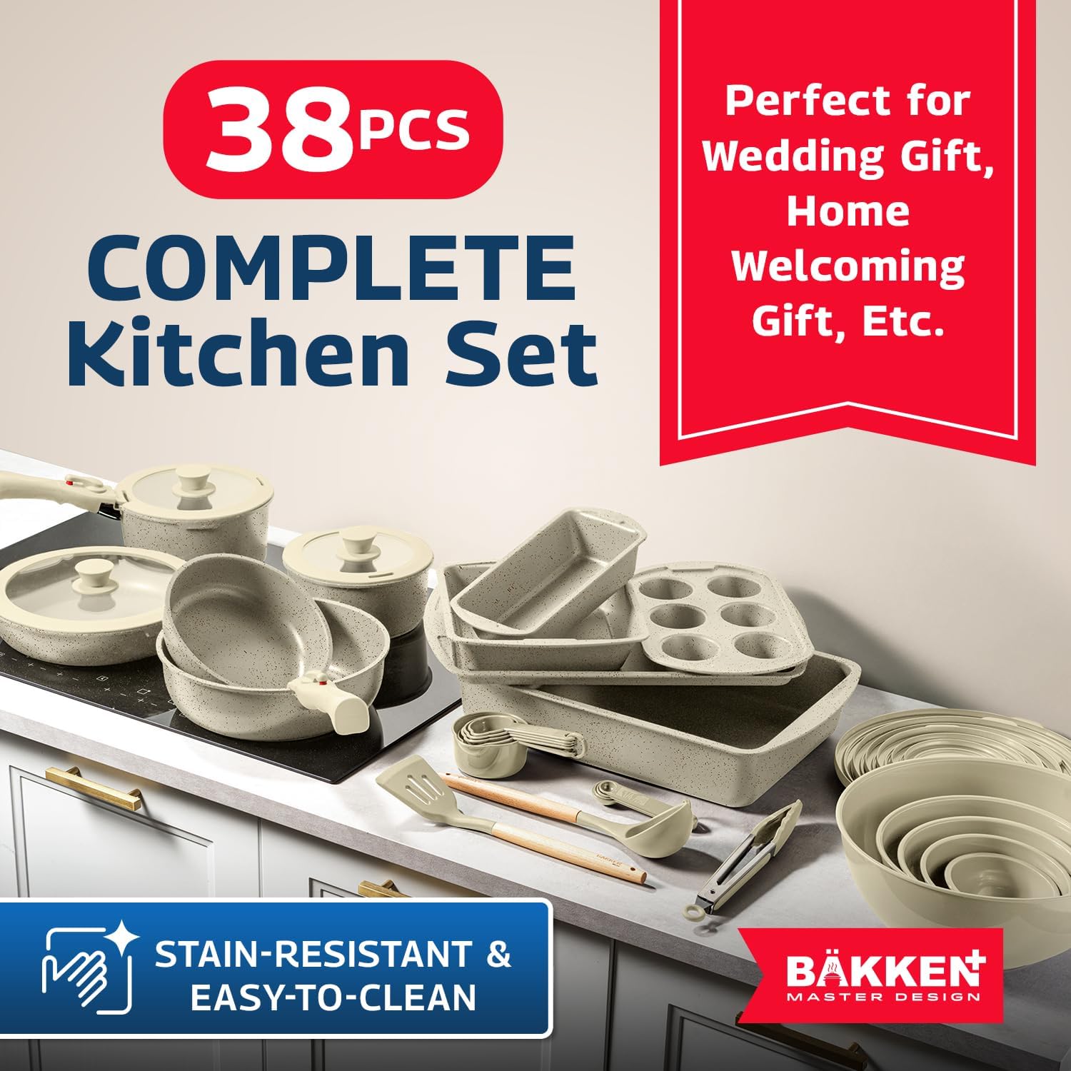 Bakken Master 38 Piece Granite Cookware and Bakeware Set – Nonstick Granite Coating, Pots and Pans with Detachable Handles and Tempered Glass Lids, 6-piece Bakeware set, 12-piece Mixing Bowls, White