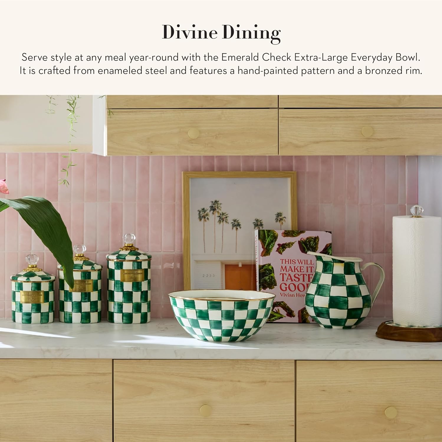 MACKENZIE-CHILDS Enamel Everyday Bowl, Serving Bowl for Entertaining, Extra Large, Green-and-White Emerald Check