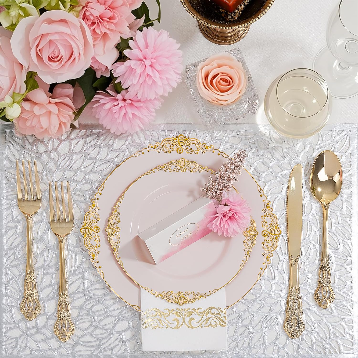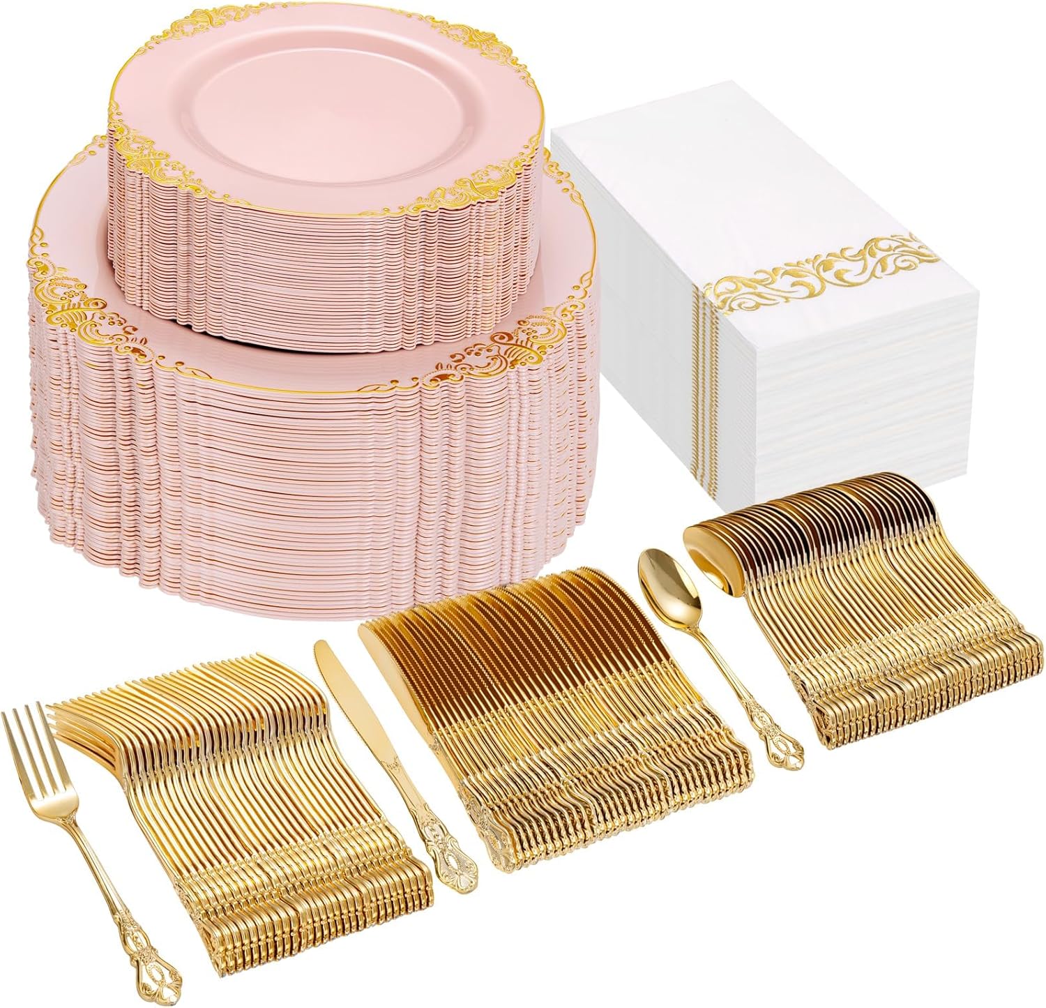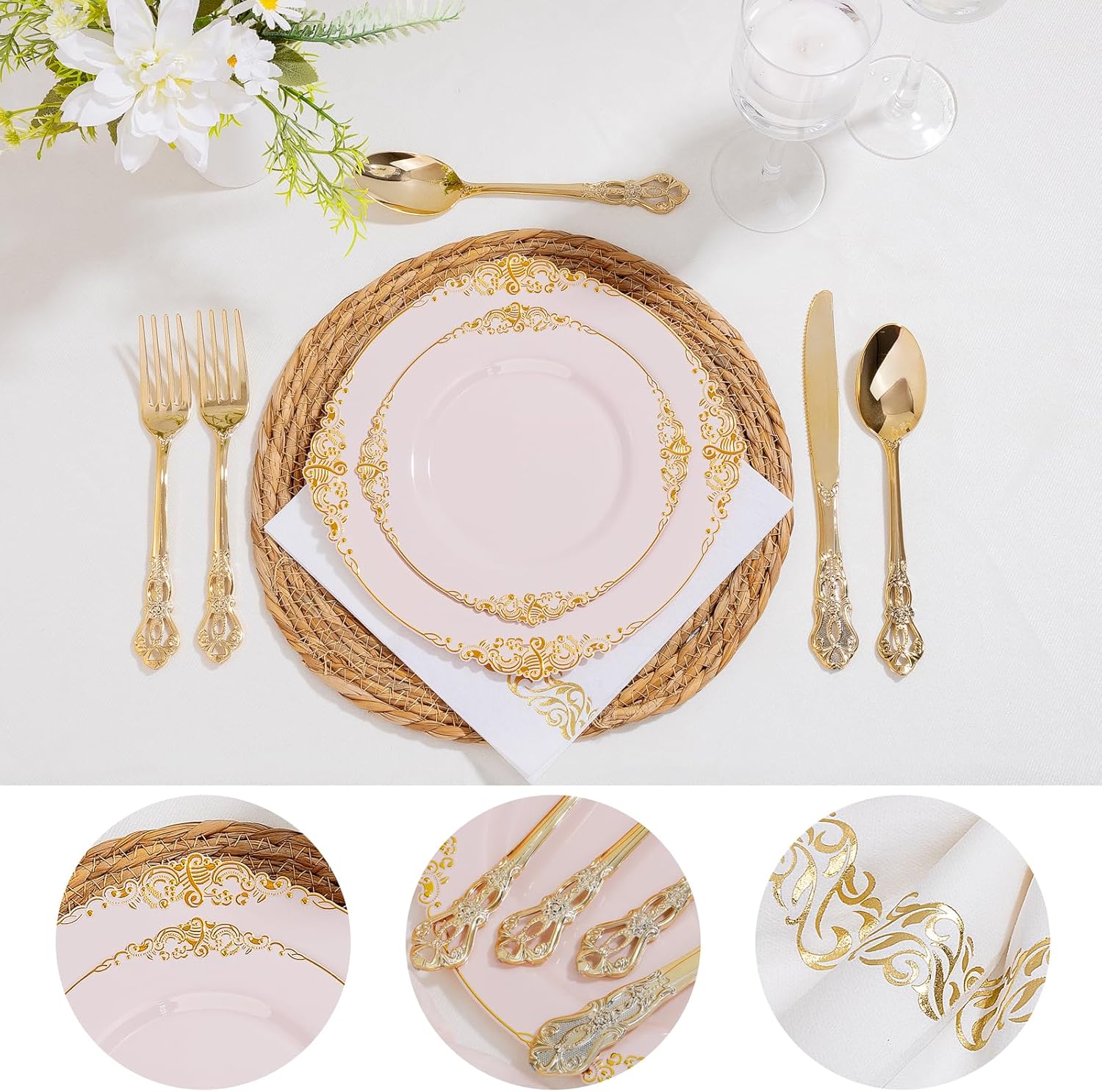 Ciaell 300PCS Pink and Gold Plastic Plates - Pink Disposable Dinnerware Sets for 50 Guests - 100 Plates, 50 Knives, 50 Forks, 50 Spoons, and 50 Napkins for Wedding, Anniversary and Party