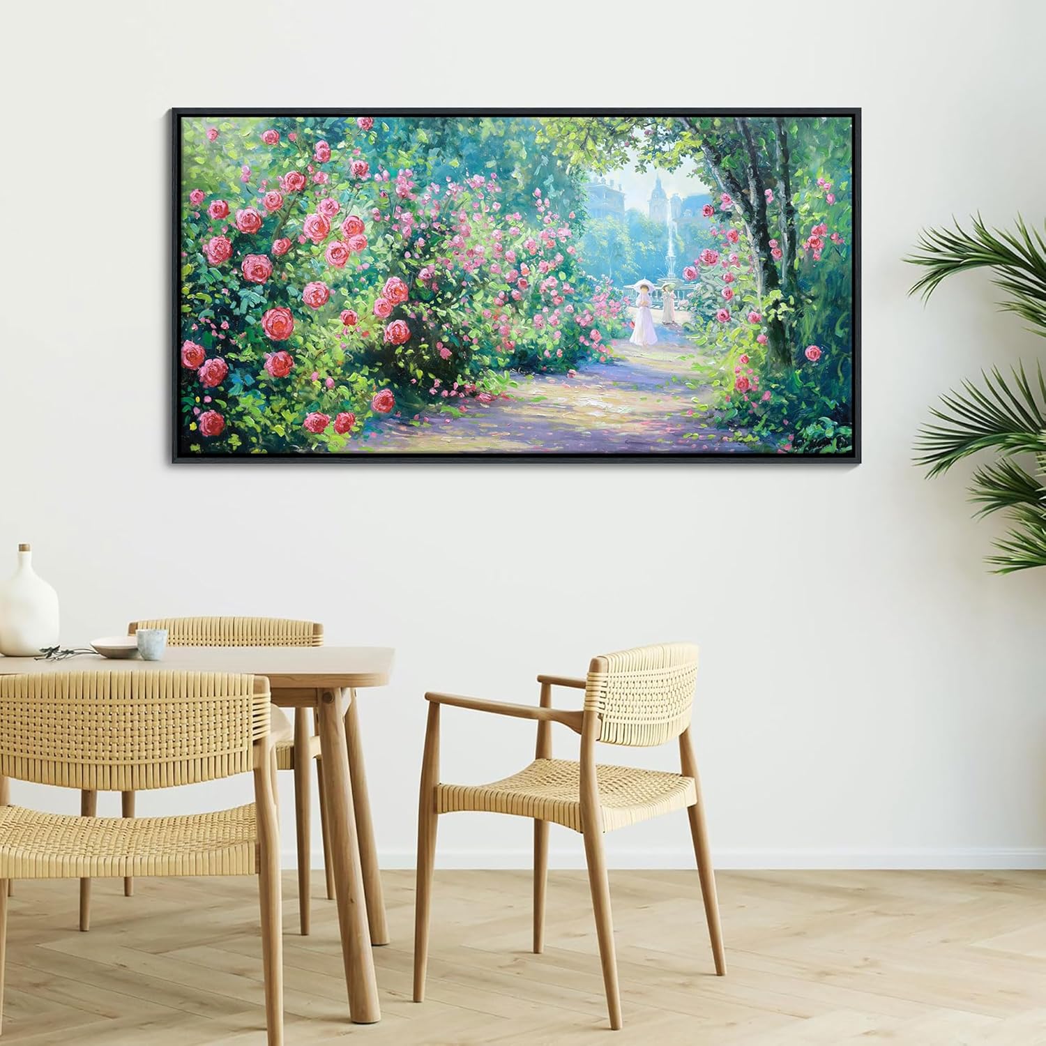 CHATYOUNG Framed Canvas Wall Art, Large Landscape Wall Painting 24"X48" Blooming Roses Spring Wall Art Green Plant Pictures for Living Room Bedroom Kitchen Home Decor Gifts for Women