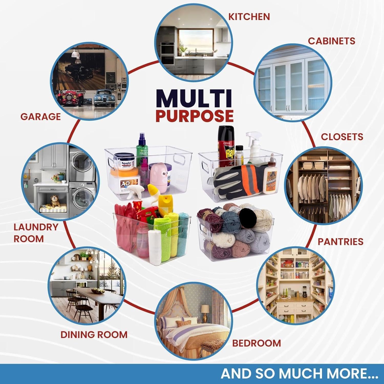 • YOU WON'T FIND A MORE VERSATILE SET OF BINS: You can use these large clear plastic storage containers with lids for organizing any space in and around your home – the kitchen, cabinets, closets, pantries, bedroom, dining room, laundry room, nursery, garage, kids toy room, under sink organizers and more.