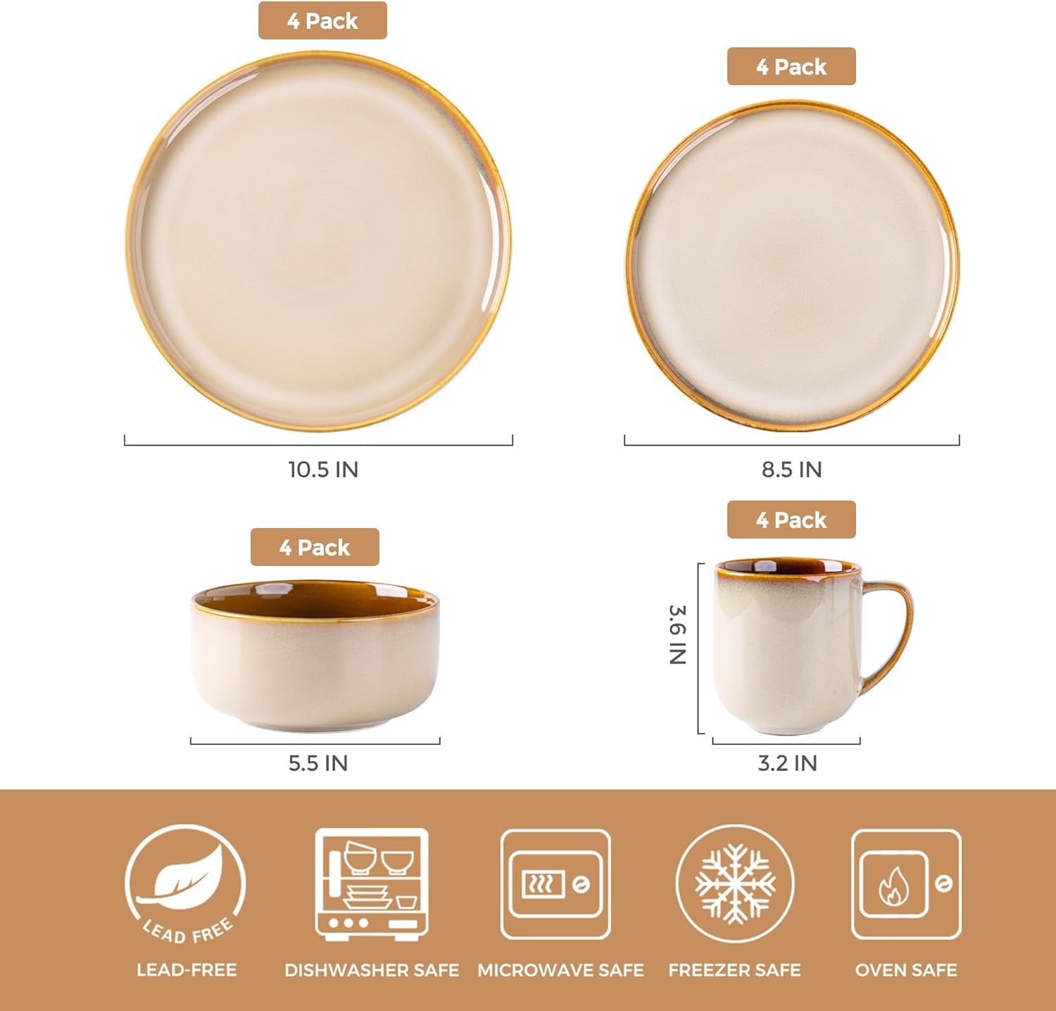 • 【WHAT YOU WILL RECEIVE】 This 16-piece dinnerware set includes 4 x 10.5-inch dinner plates, 4 x 8.25-inch salad plates, and 4 x 24 oz cereal bowls,4X 12oz Coffee mugs. Ideal for small families, couples, or individuals, this set perfectly meets all your dining needs with four complete place settings.
