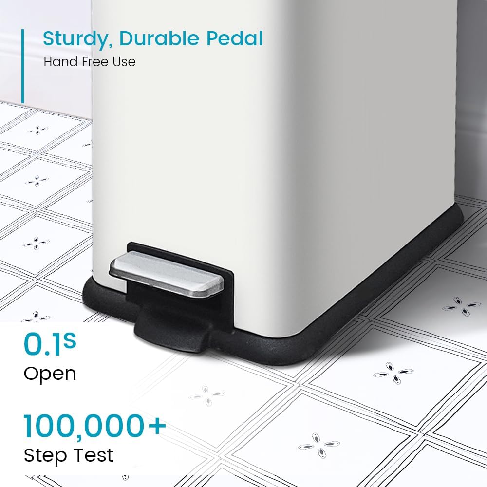 • Duable Stainless Steel: Our slim kitchen trash can with lid is made of Stainless Steel, thick and durable, and anti-fingerprint&Rust. and makes cleaning a breeze! A white finish with a sleek modern look that easily matches any decor.