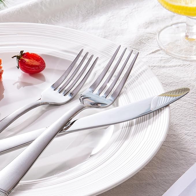 • Size and Use Occasion: This cutlery set contains 8 dinner forks(8.24 inch), 8 salad forks(6.73 inch), 8 dinner knives(9.06 inch), 8 dinner spoons(7.99 inch) and 8 teaspoons(6.73 inch). Perfect for family dinners, weddings, banquets, and daily use.