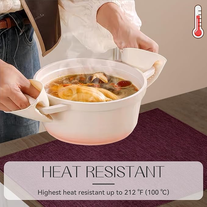 • THICKENED AND HEAT-RESISTANT: Our placemats feature a double-layered faux linen fabric which is heat-resistant up to 220°F (100°C) . They will prevent hot dishes, stains, and scratches from damaging your tables or furniture.